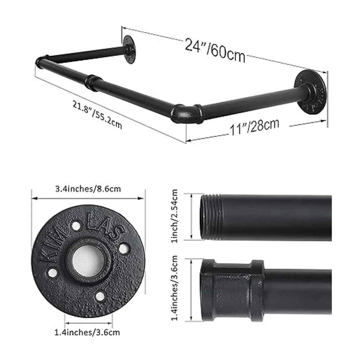 Consulta el video de instrucciones de instalación en el bloque de imagen principal. Tamaño: 24 pulgadas de largo x 11 pulgadas de alto. 2 bases. Base redonda: 311/32 pulgadas. Perchero montado en la pared con tubo industrial.