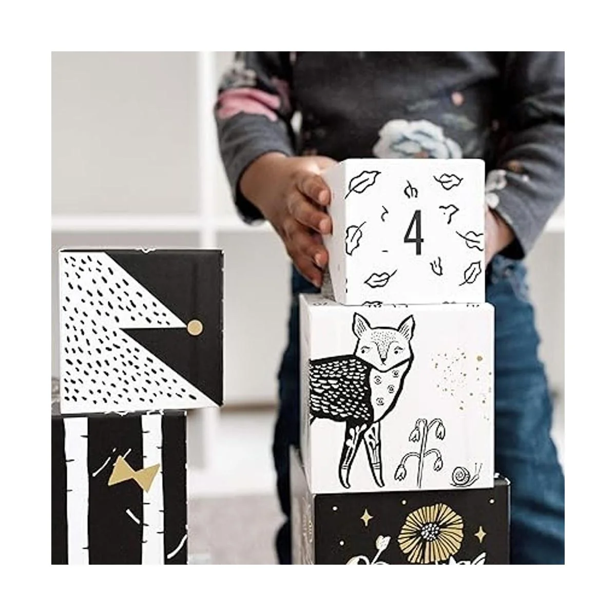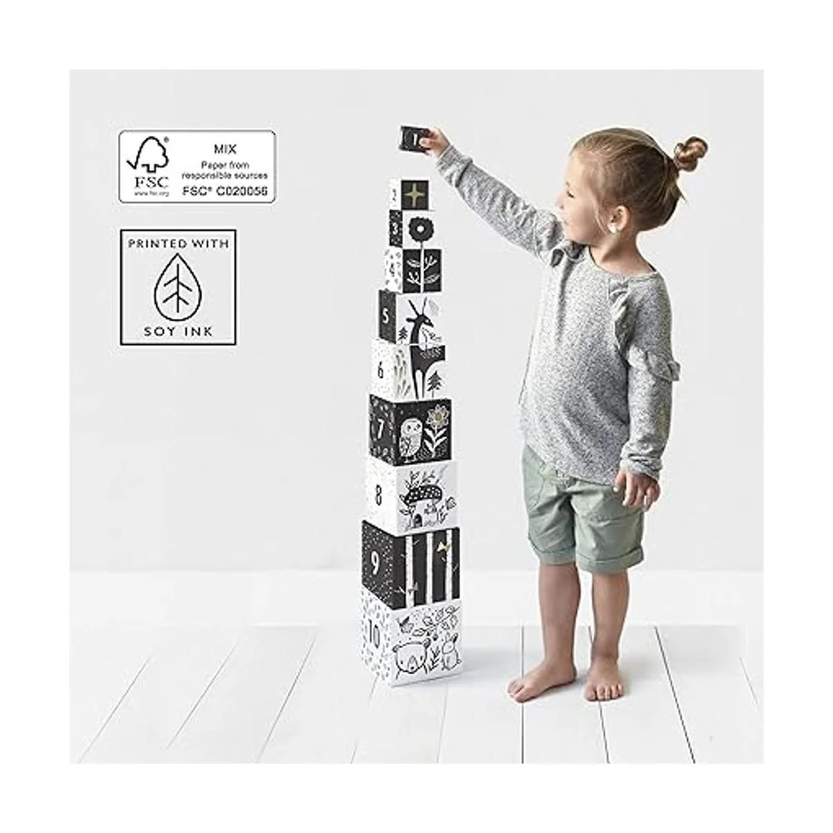 Wee Gallery Bloques de anidación animales y números del bosque, juguete de construcción y apilamiento en blanco y negro para niños pequeños y niños, habilidades motoras, juego creativo y resolución de problemas para niños edad 2 en adelante