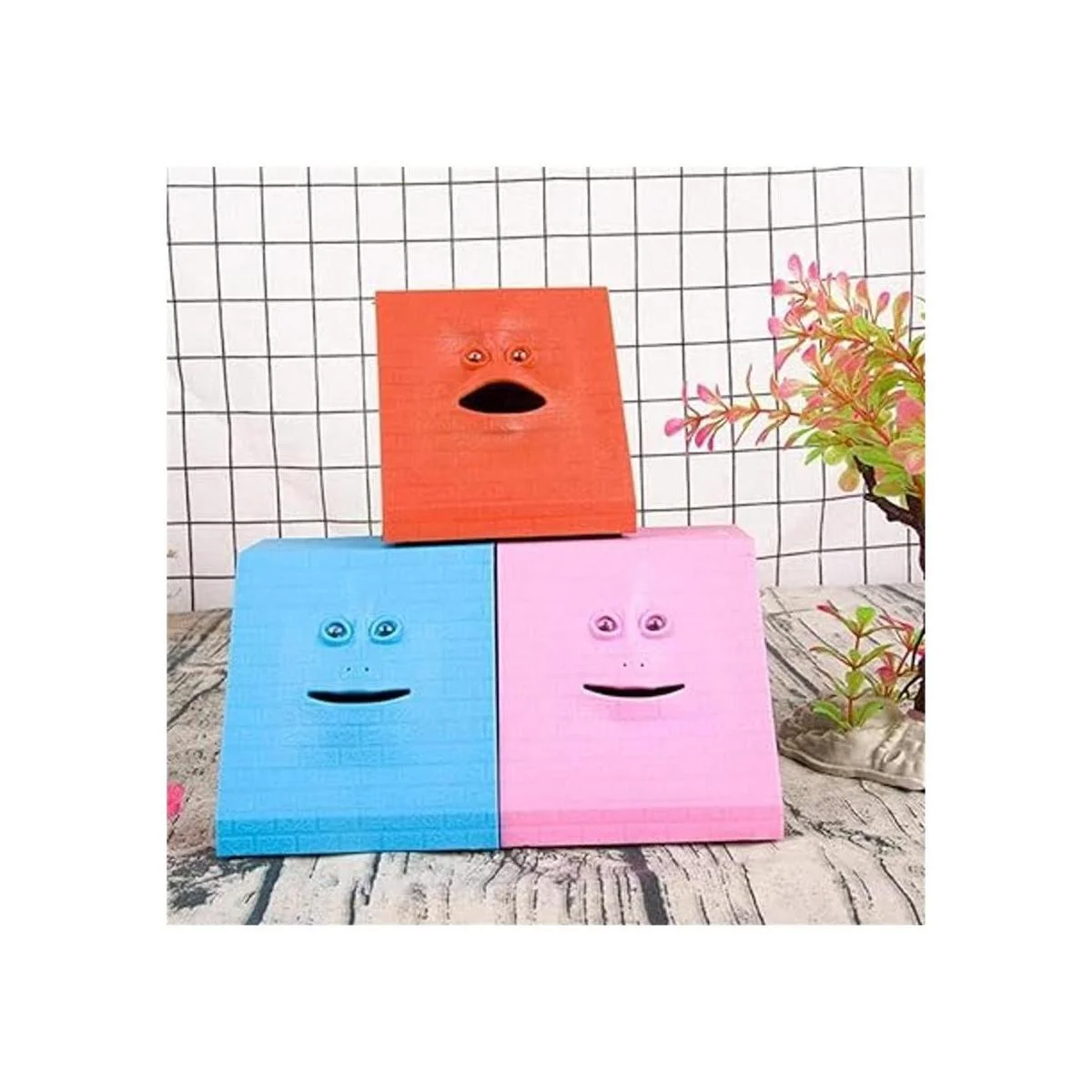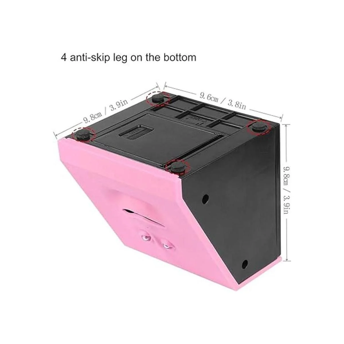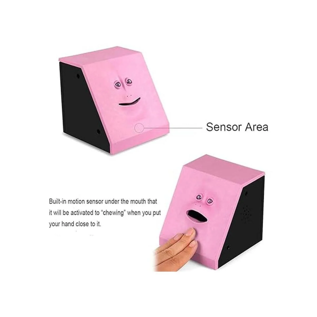 Activado por movimiento: sensor de movimiento integrado debajo de la boca que se activará cuando coloques la mano cerca de él. Entonces con música, el banco se comerá las monedas.