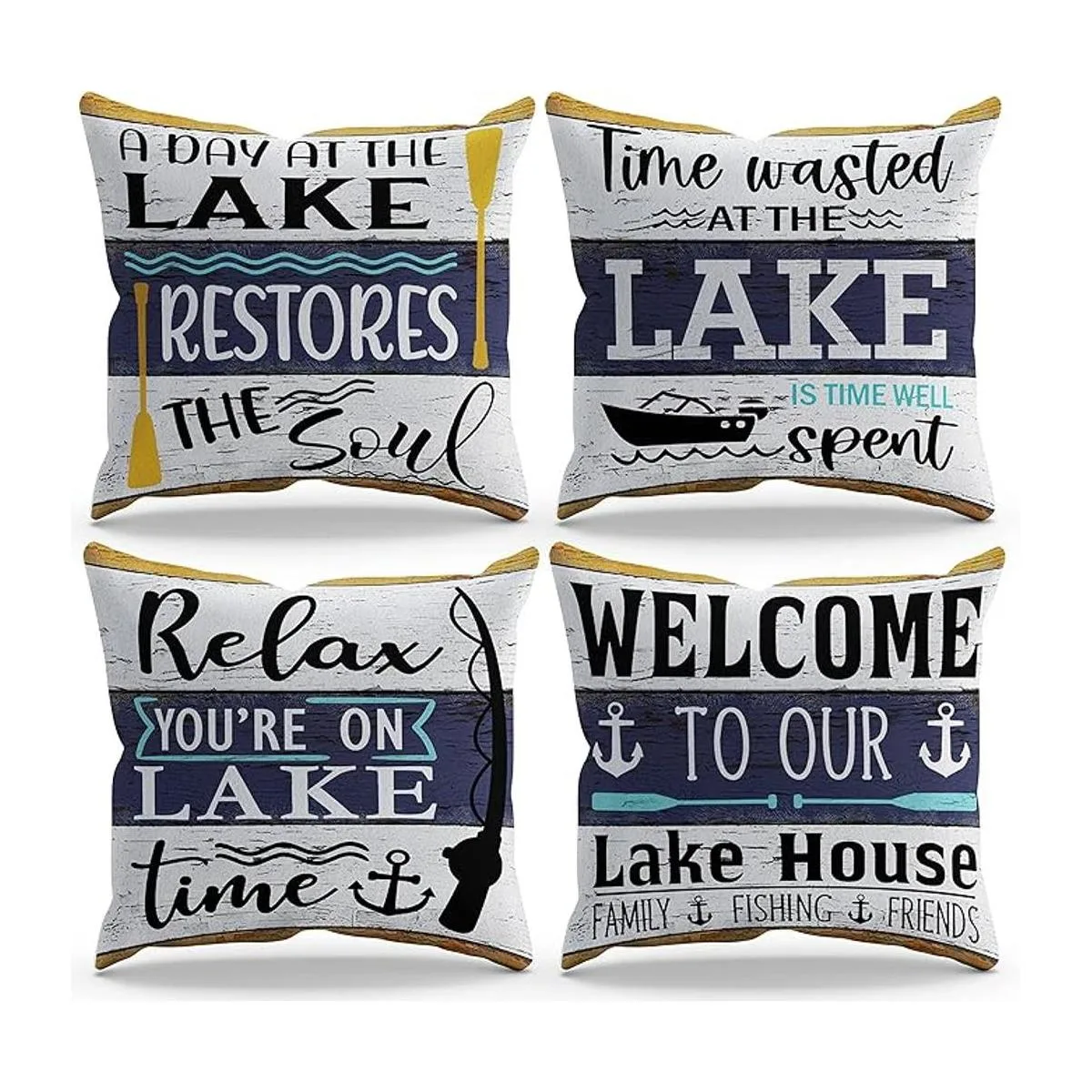 Welcome to Our Lake House Relax Youre On Lake Time Juego de 4 fundas de almohada de 18 x 18 pulgadas, decoración de porche de lago para casa de campo, lago, porche, banco de lago, casa de lago, sofá de cama