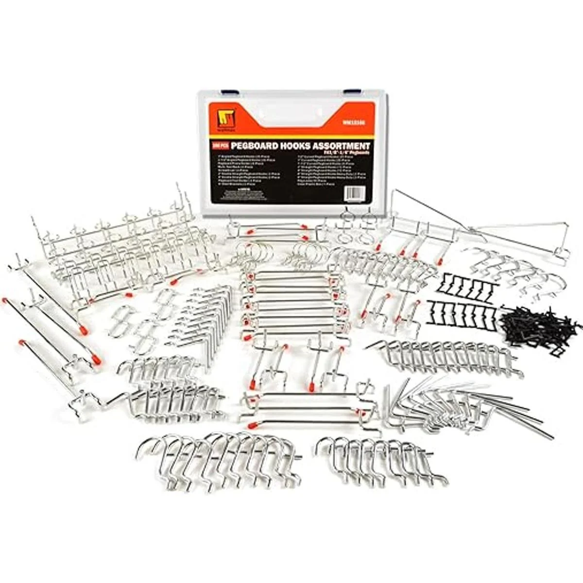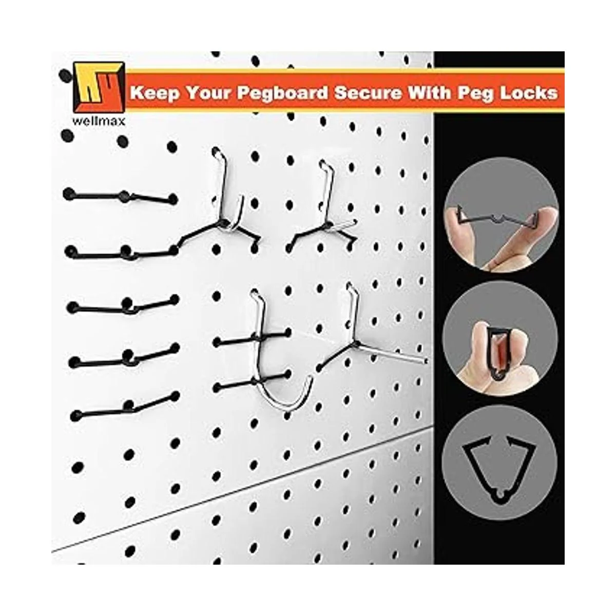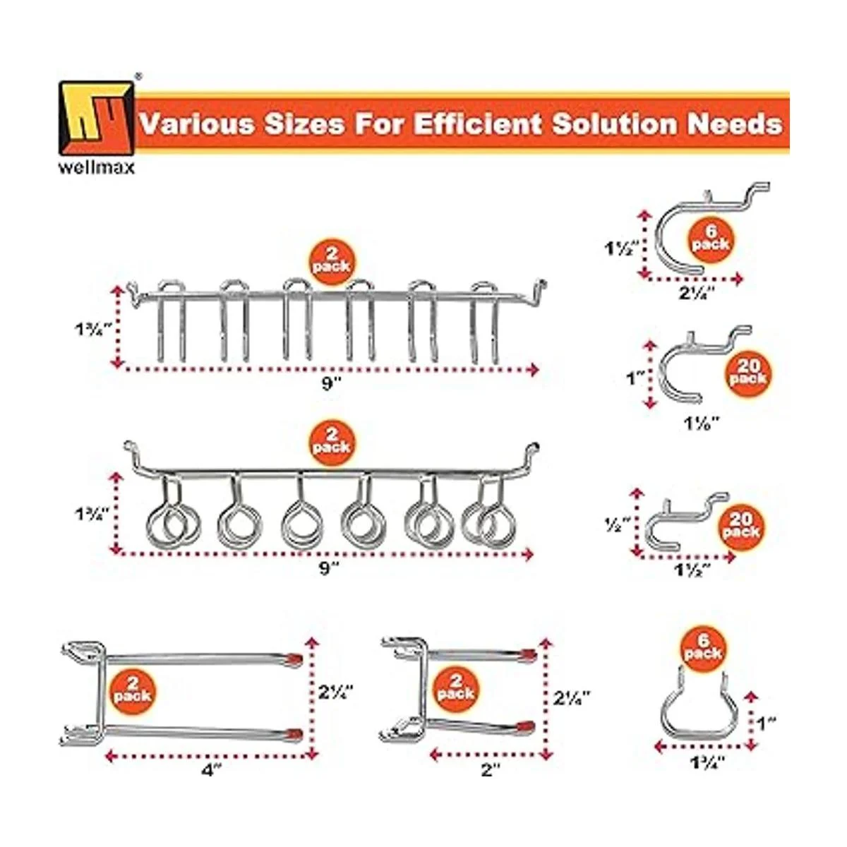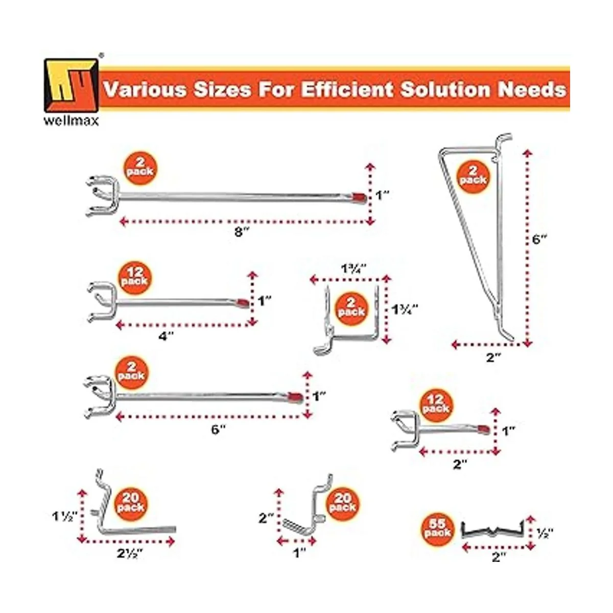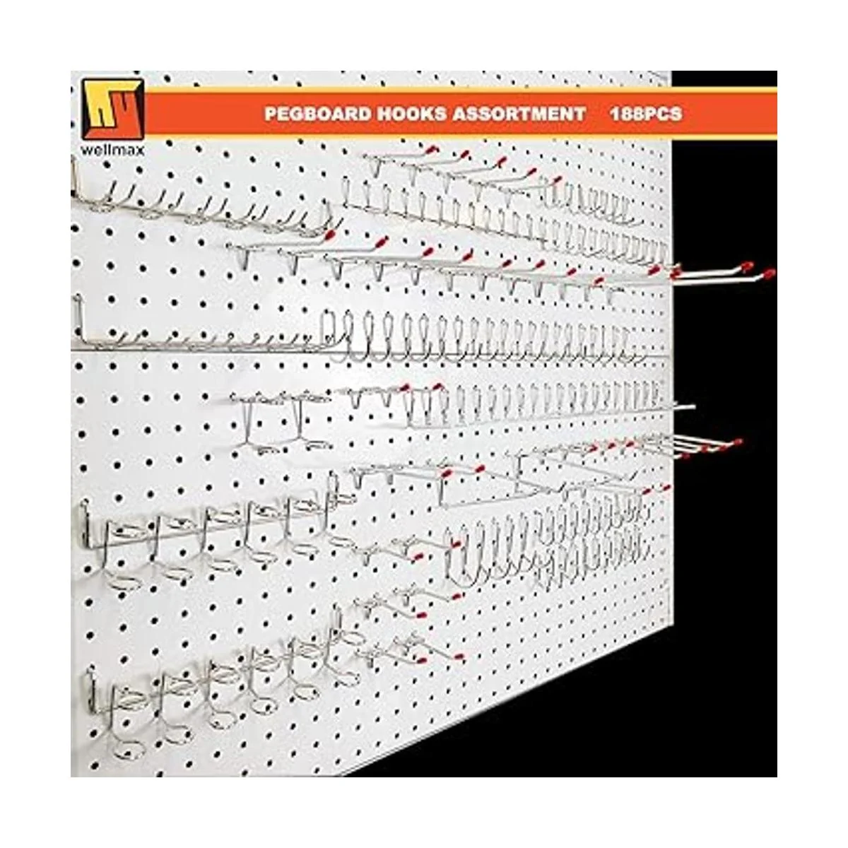 Wellmax Juego de 188 ganchos para tablero de clavijas de alta resistencia, perfecto para herramientas, manualidades, tableros de clavijas y accesorios de clavijas. Se adapta a agujeros de 14 y 18 pulgadas