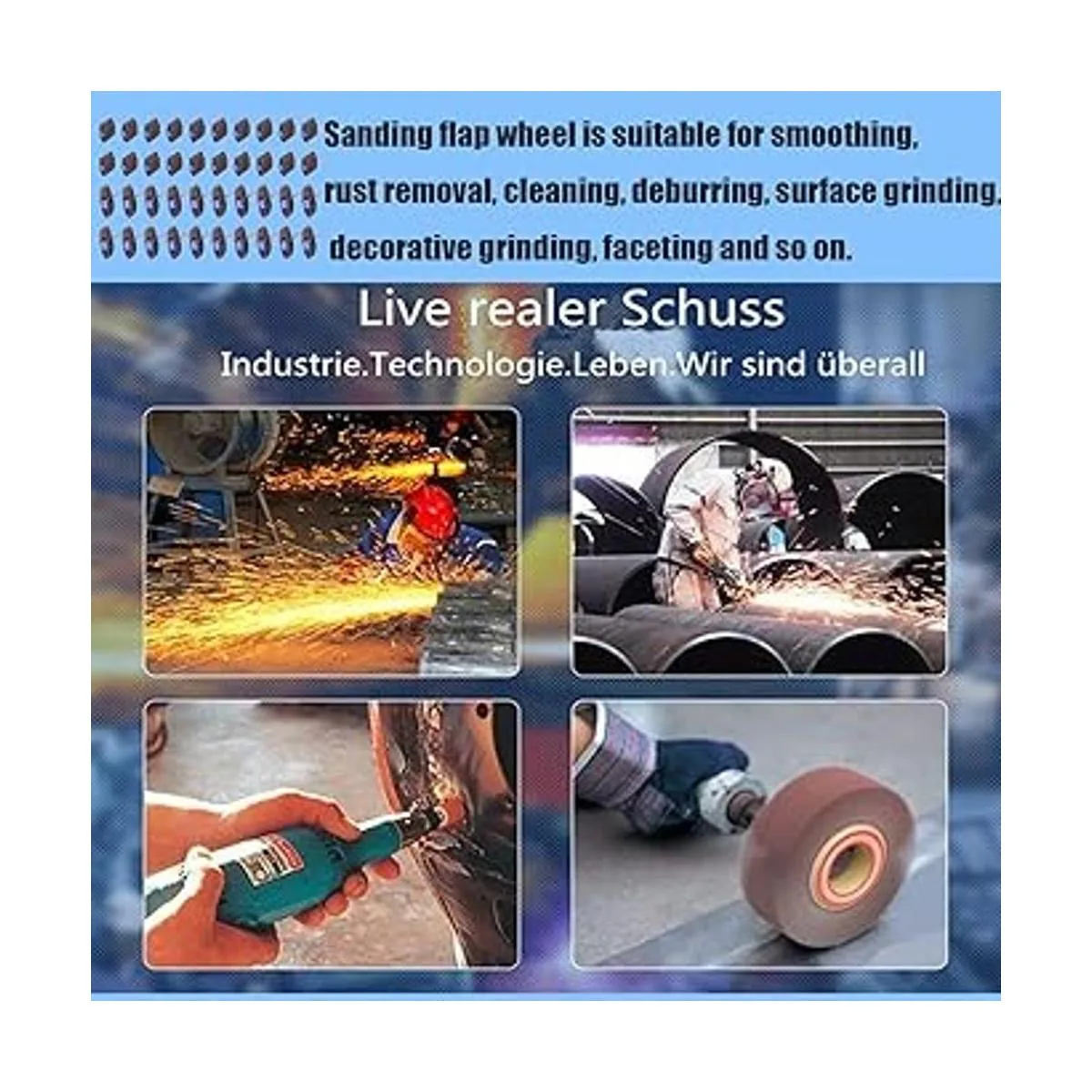 Ruedas de solapa utilizadas para moler y pulir superficies planas o contorneadas, pueden funcionar en madera, metal, plástico, goma, acero, etc.