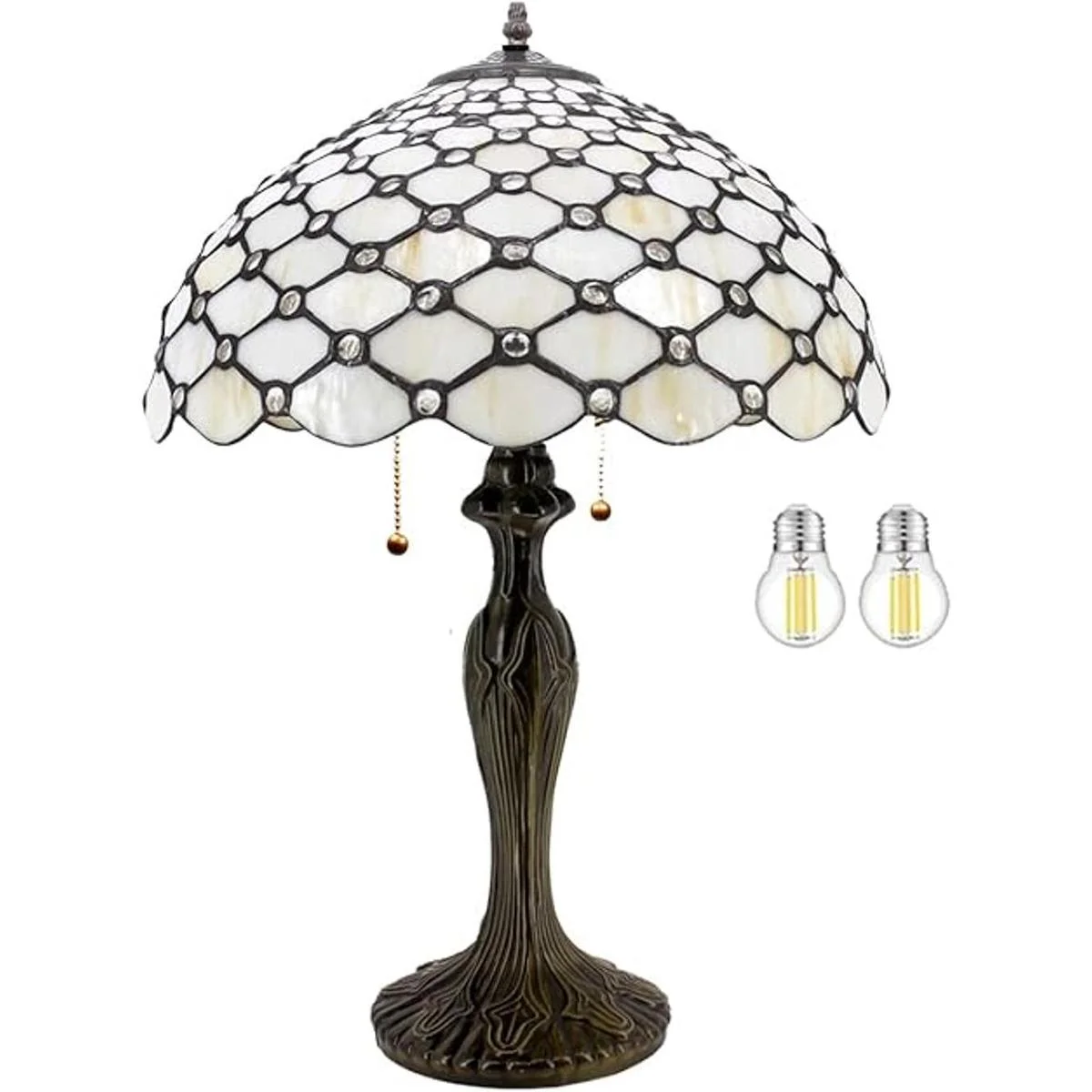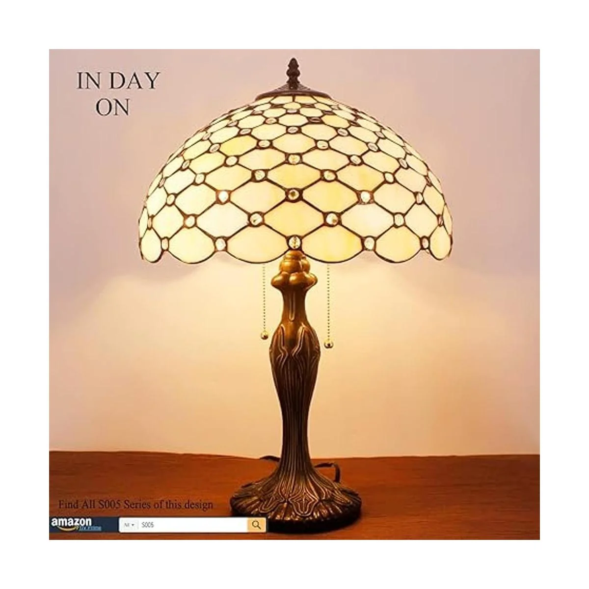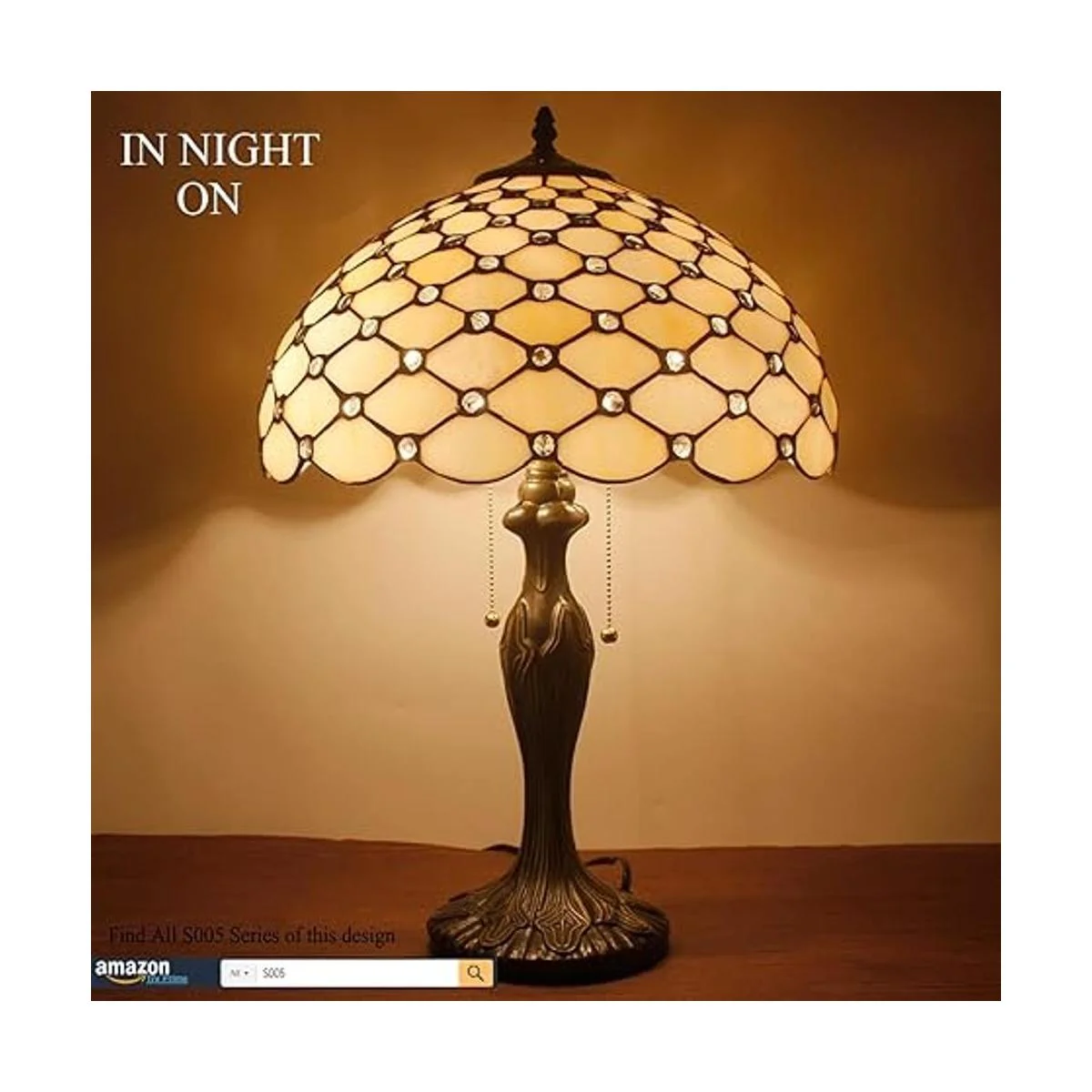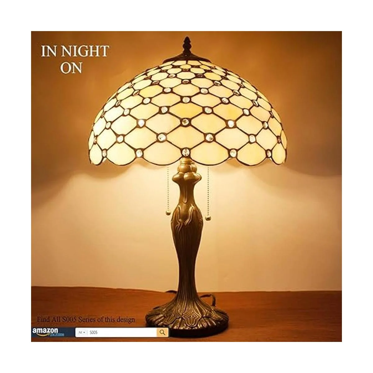 WERFACTORY Tiffany Lámpara de mesa de cristal de 16 x 16 x 24 pulgadas, lámpara de lectura con cuentas de perlas de color crema, luz de lectura de base de metal, decoración para dormitorio, sala de estar, oficina en casa, serie S005