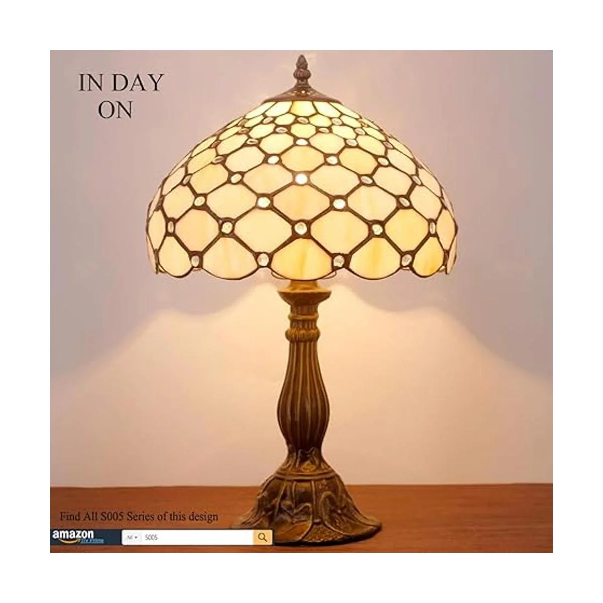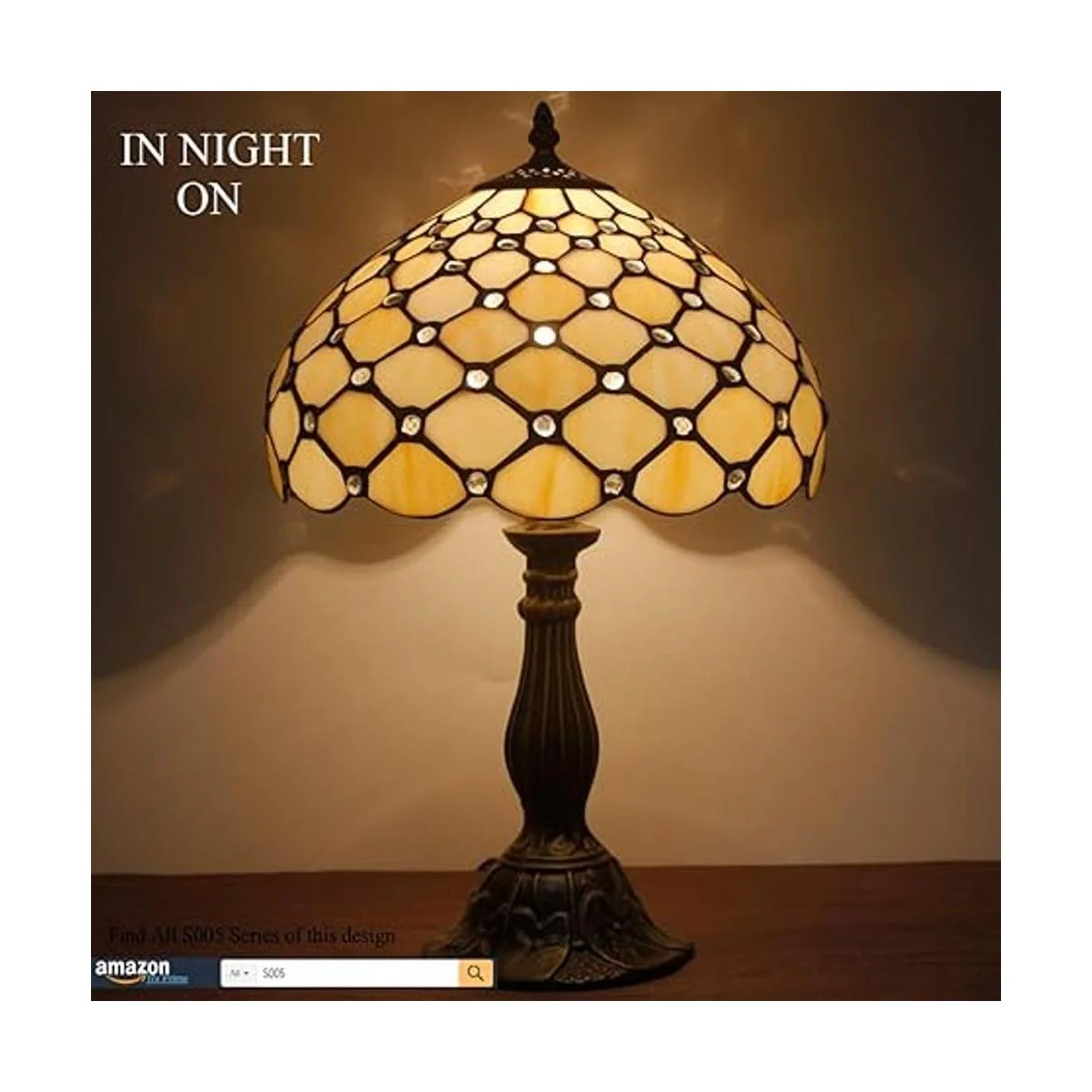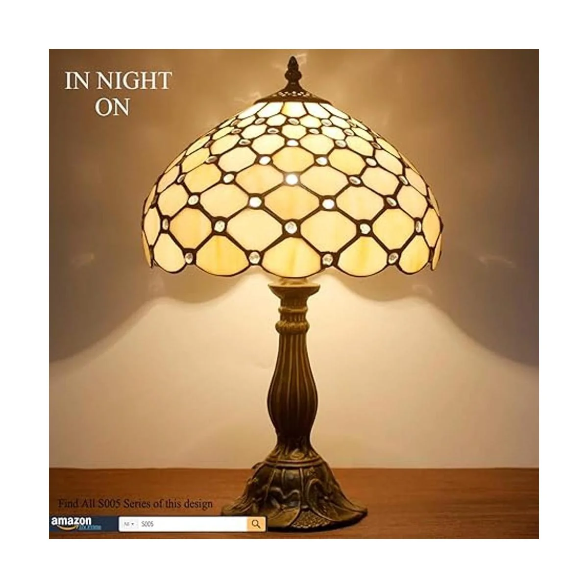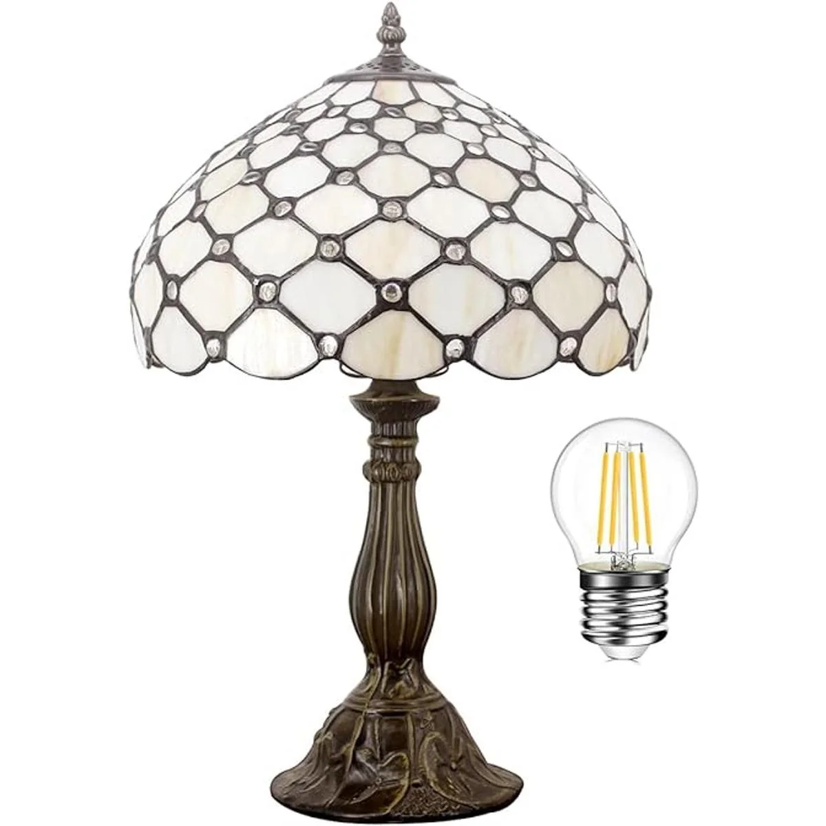 WERFACTORY Tiffany Lámpara de mesa de noche de color ámbar crema, con cuentas de vidrio teñido, luz de lectura de escritorio de 12 x 12 x 18 pulgadas, decoración de mesita de noche, dormitorio, sala de estar, oficina en casa bombilla LED incluida, serie S005