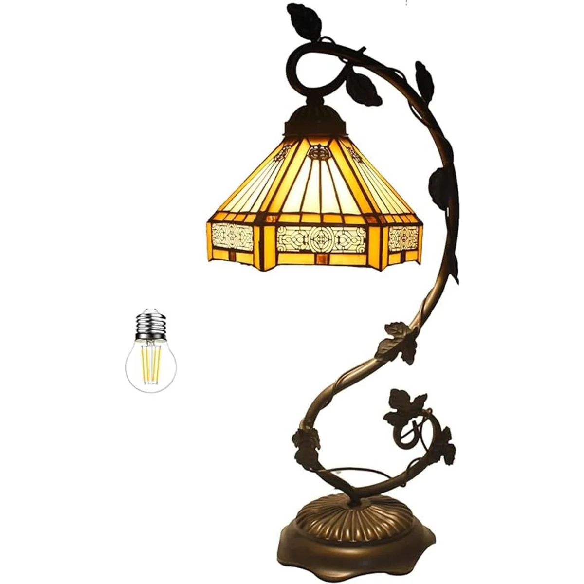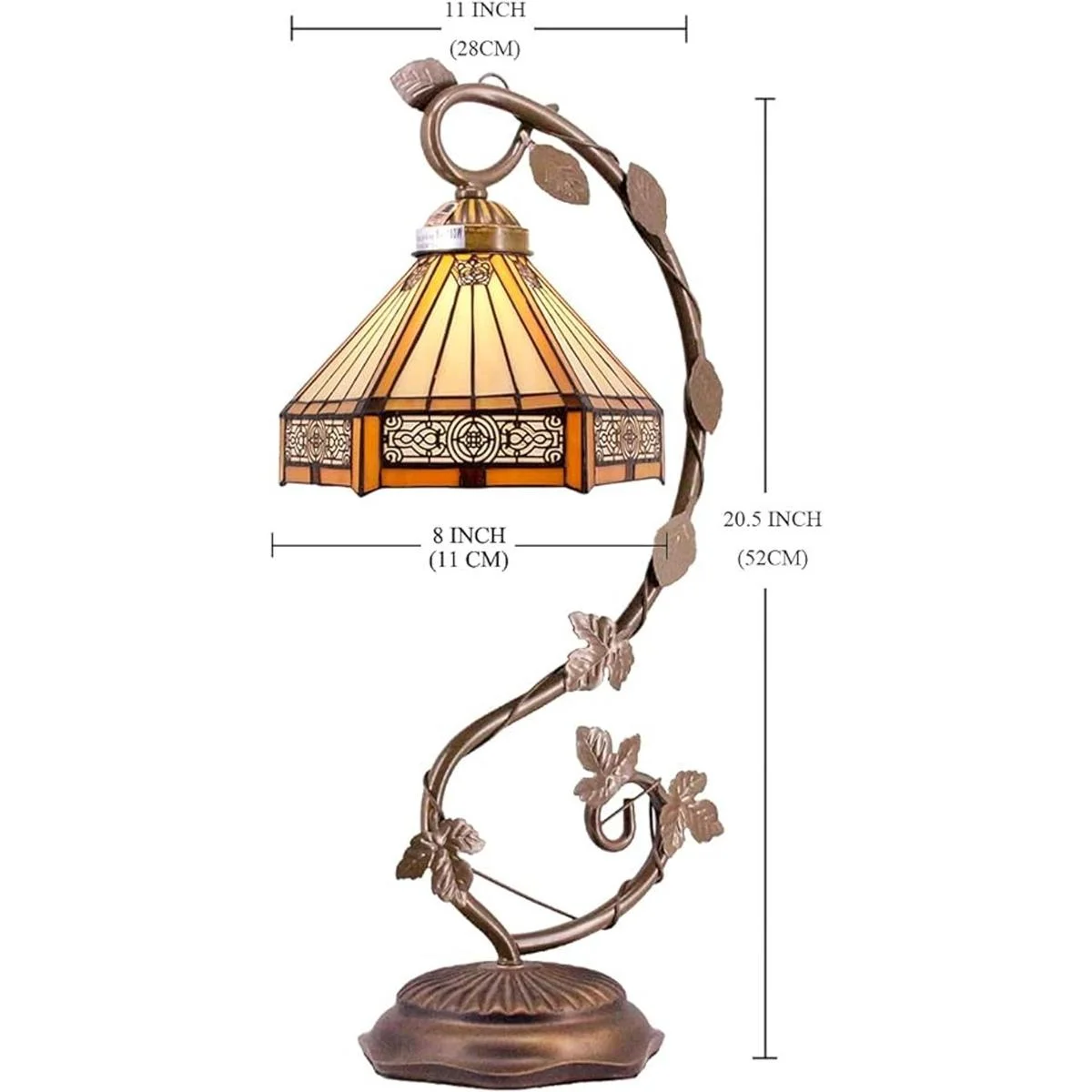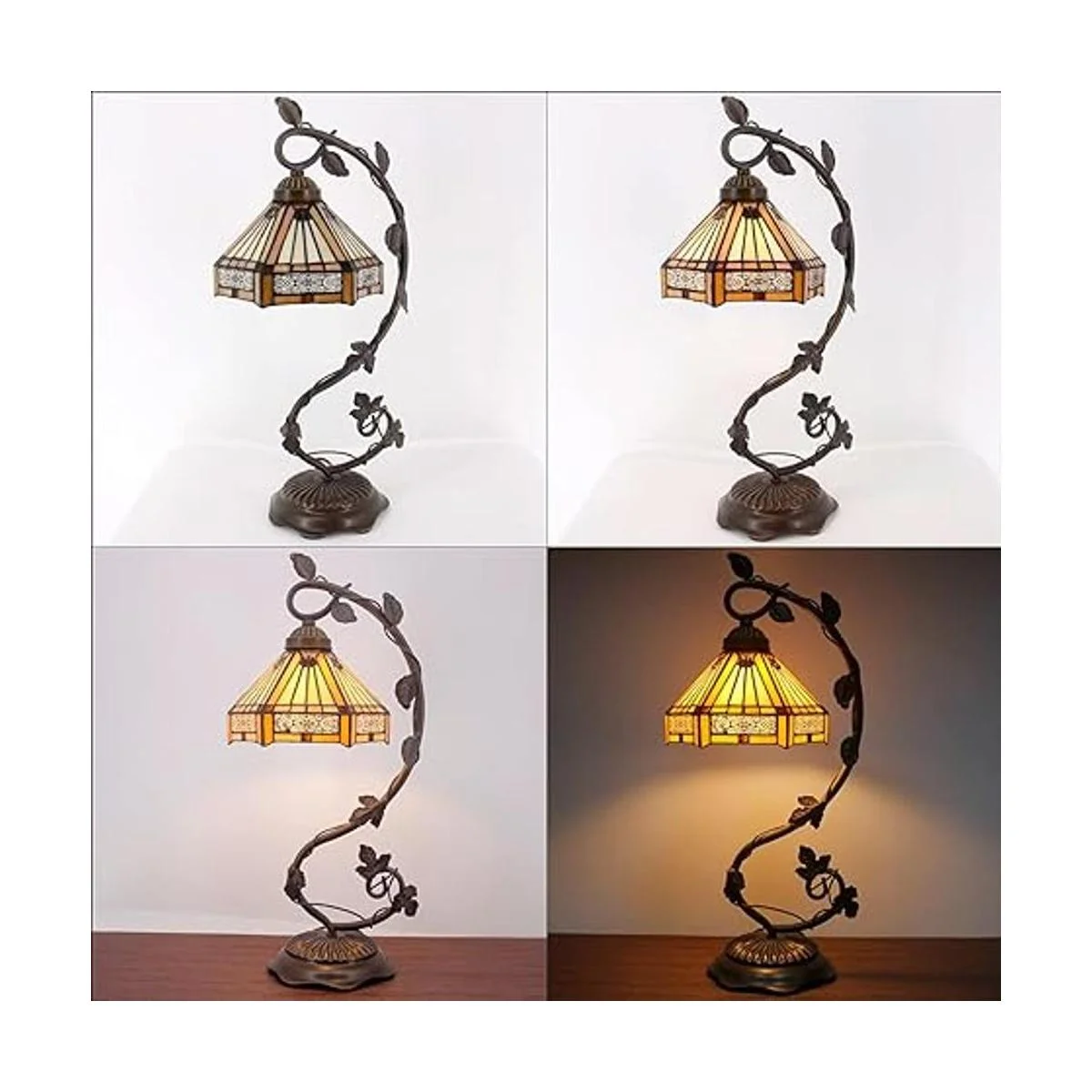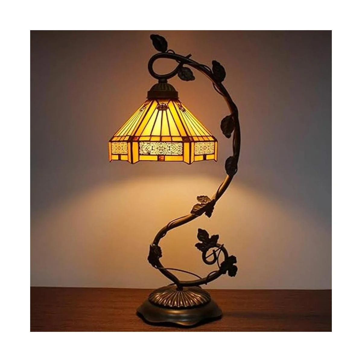WERFACTORY Tiffany Lámpara de mesa de vitrales, color amarillo, hexágono misión, mesita de noche, luz de lectura, base de hojas de metal, 8 x 10 x 21 pulgadas, decoración de espacios pequeños, dormitorio, hogar, oficina, serie S011