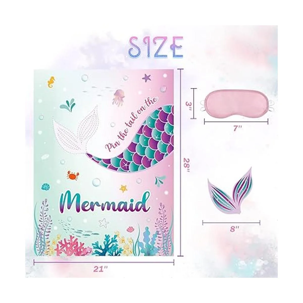 Los productos incluyen: 1 póster de sirena de 21 x 28 pulgadas, 24 calcomanías reutilizables con purpurina en 6 colores, 1 máscara de ojos suave y 20 puntos de pegamento.