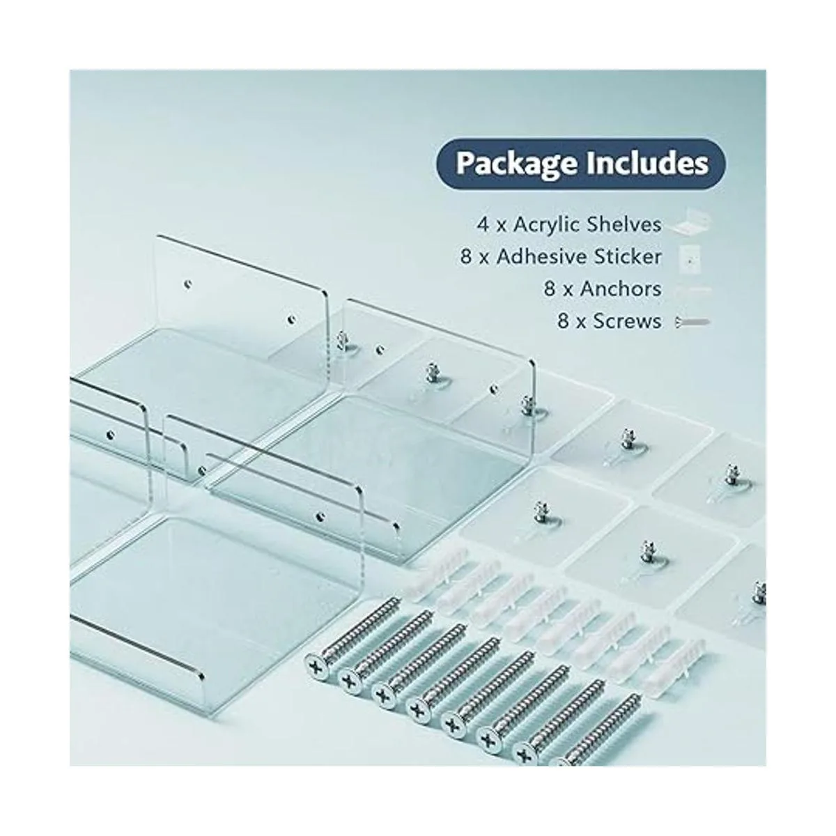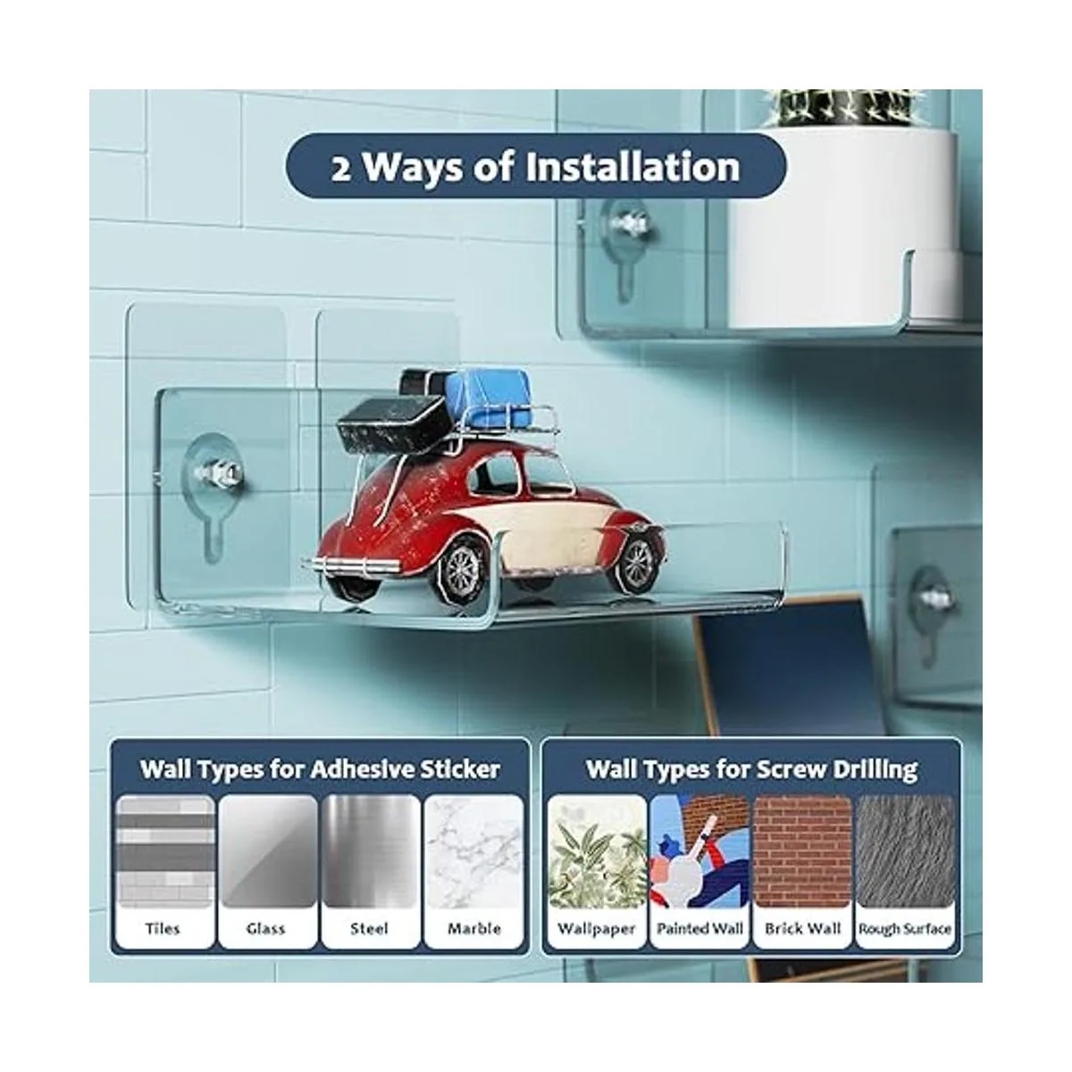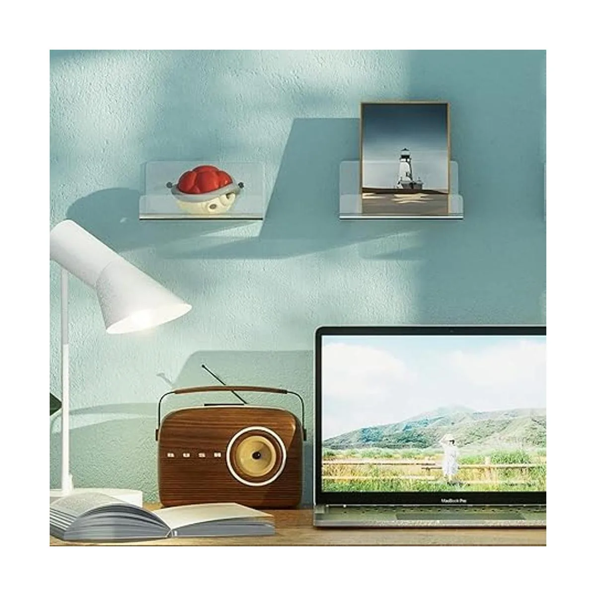 Weronique Paquete de 2 estantes de pared pequeños adhesivos flotantes acrílicos, estantes colgantes con 2 tipos de instalación, transparente