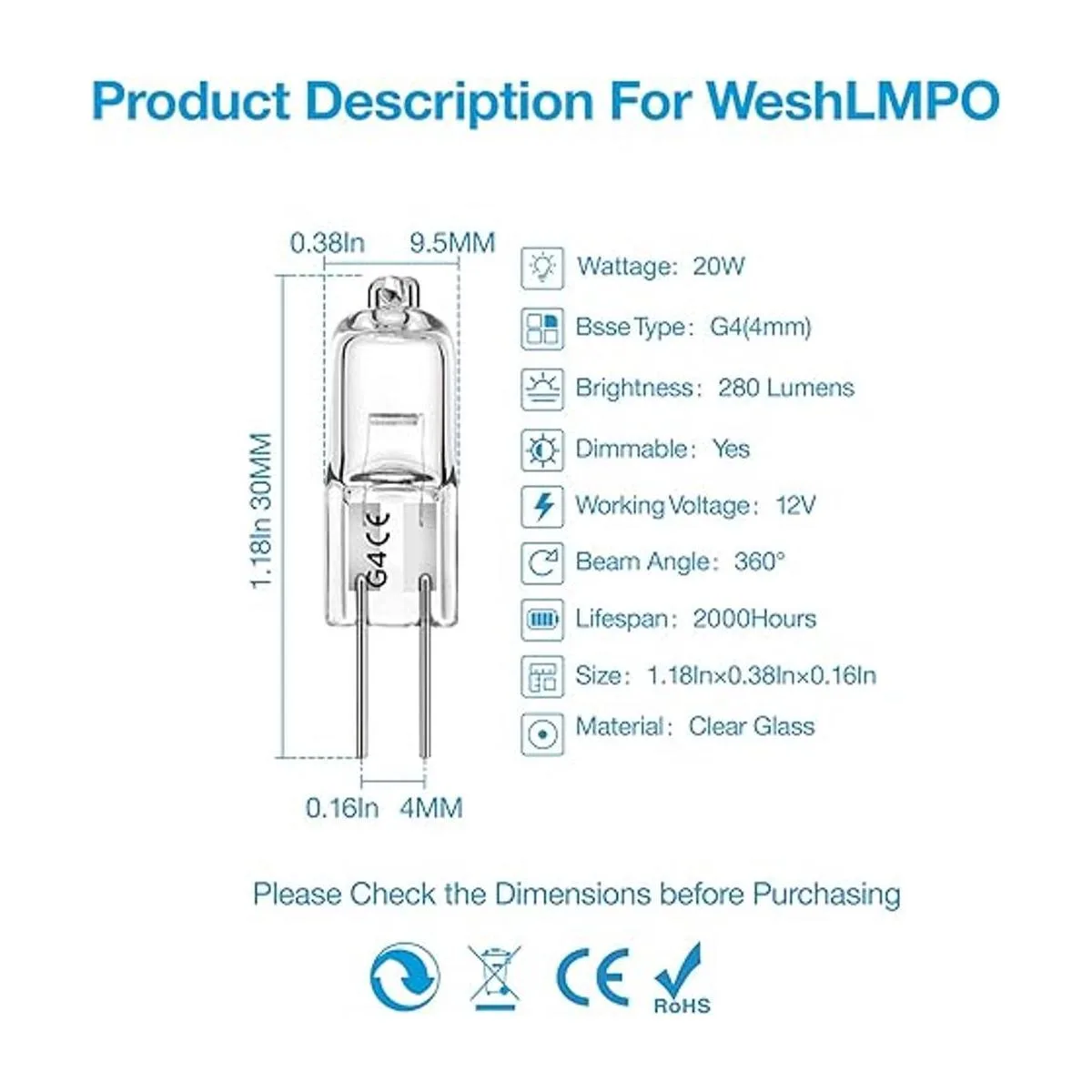 WeshLMPO Bombilla G4, bombillas halógenas de 12 V 20 W, 2 pines, bombillas G4 de repuesto para luz de disco debajo del gabinete, candelabros, luces de acento, iluminación de pista paquete de 12