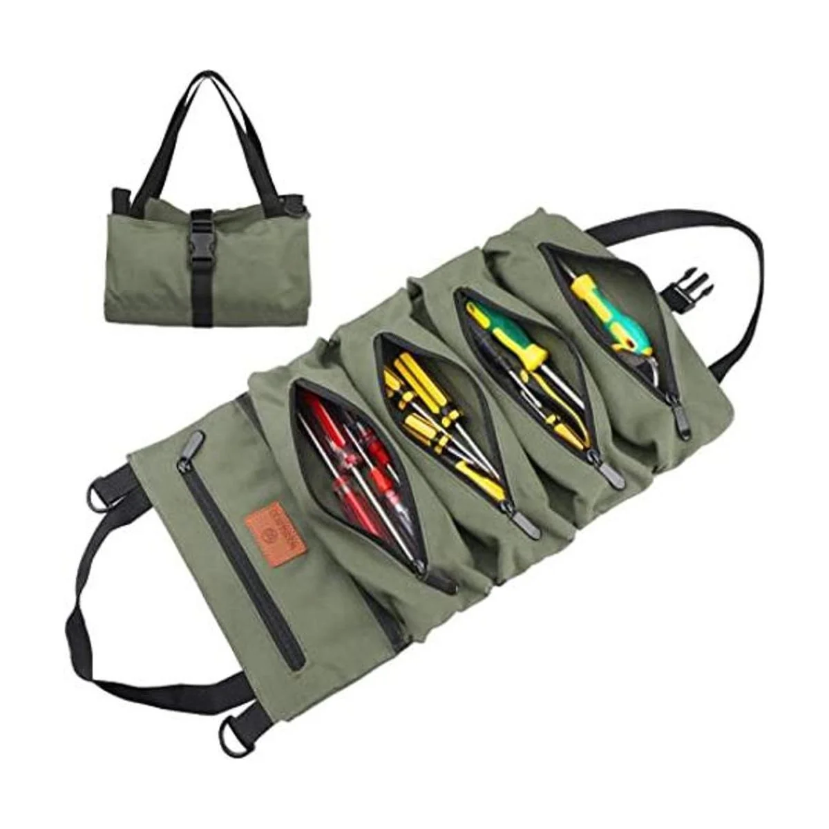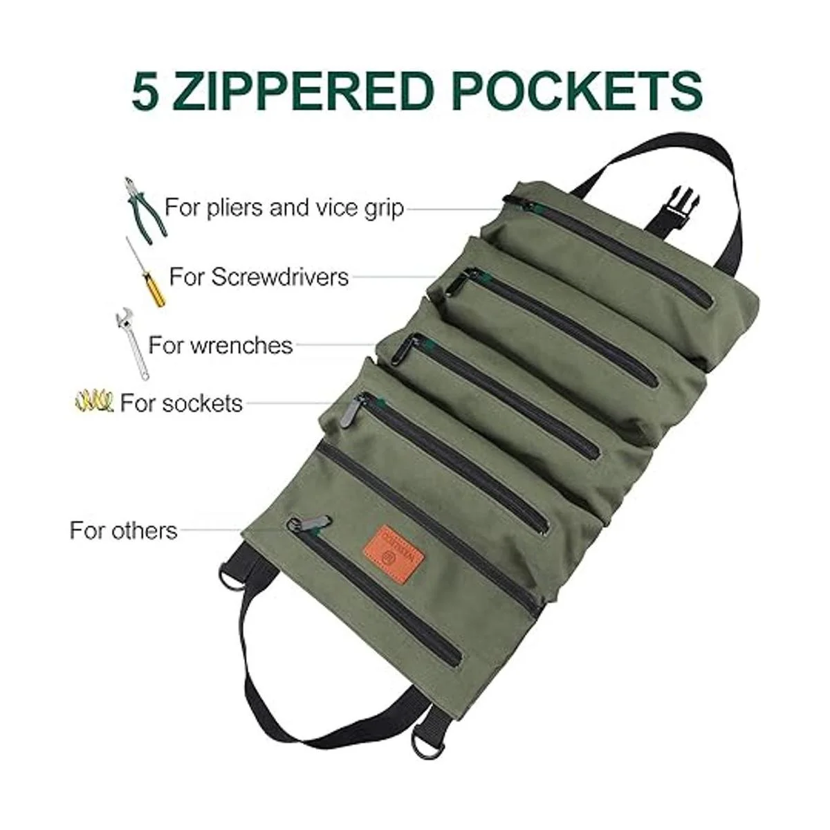 Wessleco Bolsa enrollable para herramientas, bolsa enrollable multiusos de lona de 16 onzas, 5 bolsillos con cremallera, organizador de rollos de herramientas para electricistas, llaves y herramientas verde