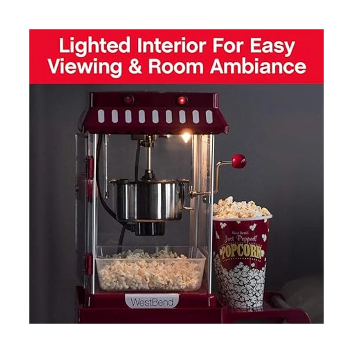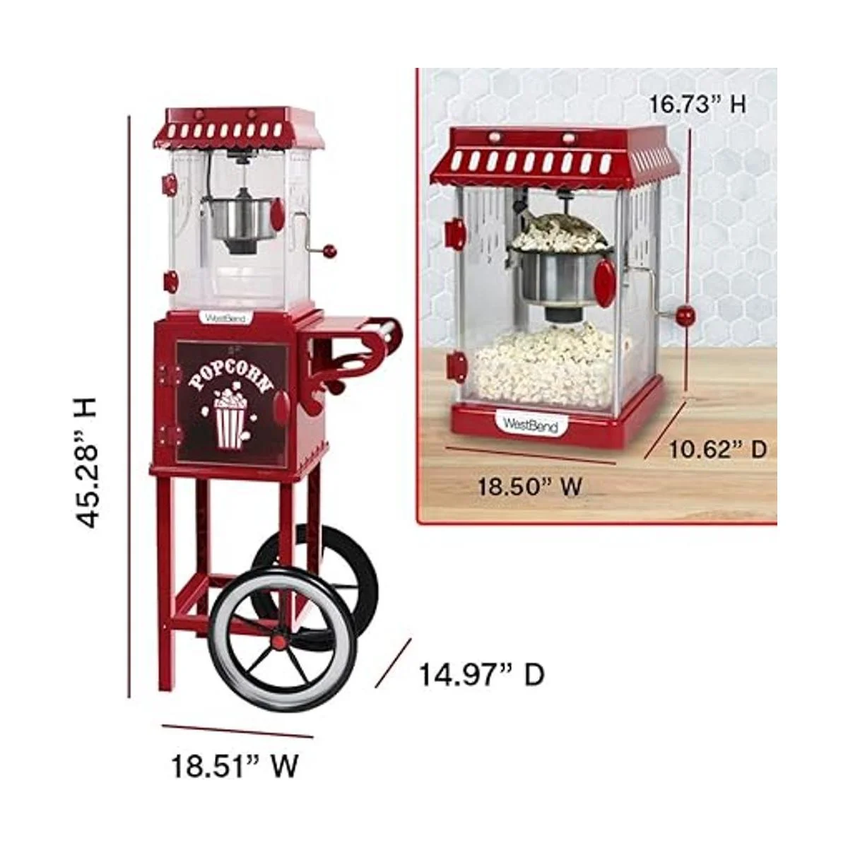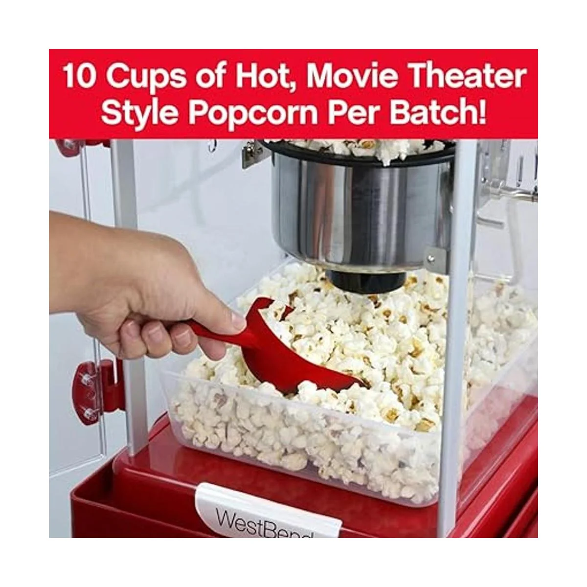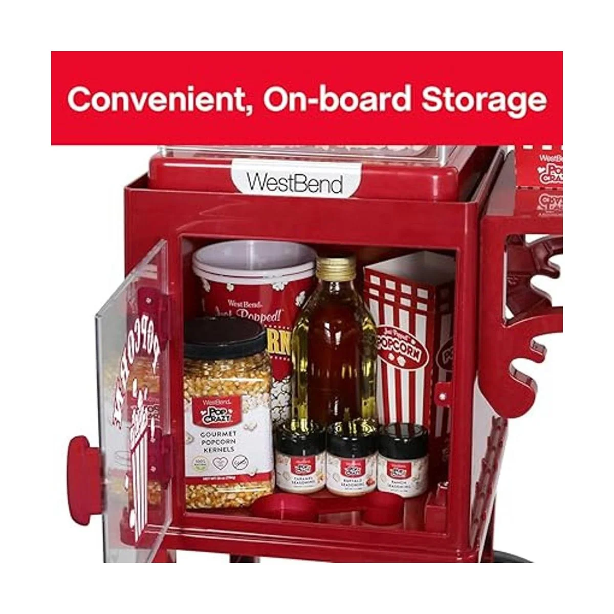West Bend PCMC20RD13 Caldera antiadherente de acero inoxidable para palomitas de maíz hace 10 tazas, cuenta con almacenamiento de estante de preparación y ruedas para una fácil movilidad, incluye herramienta de medición, 2.5 onzas, color rojo