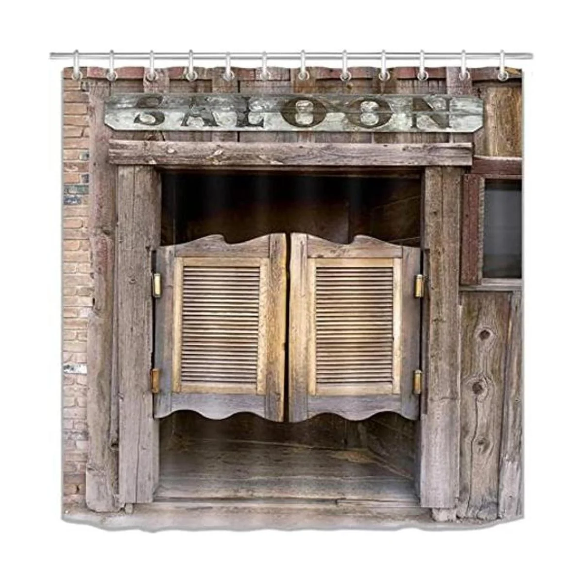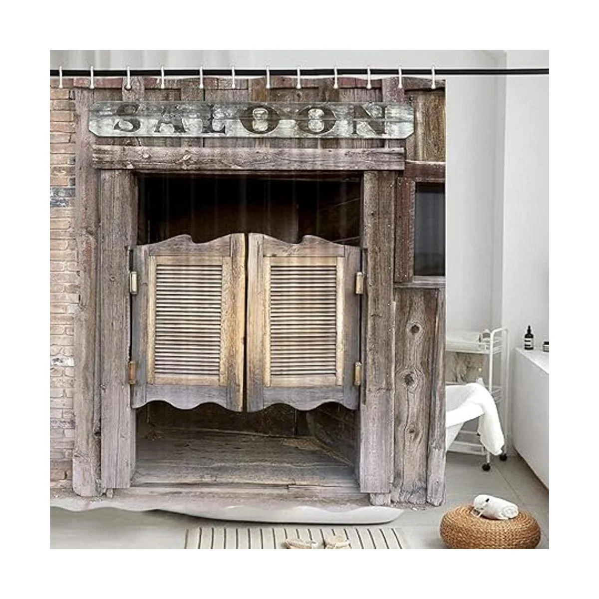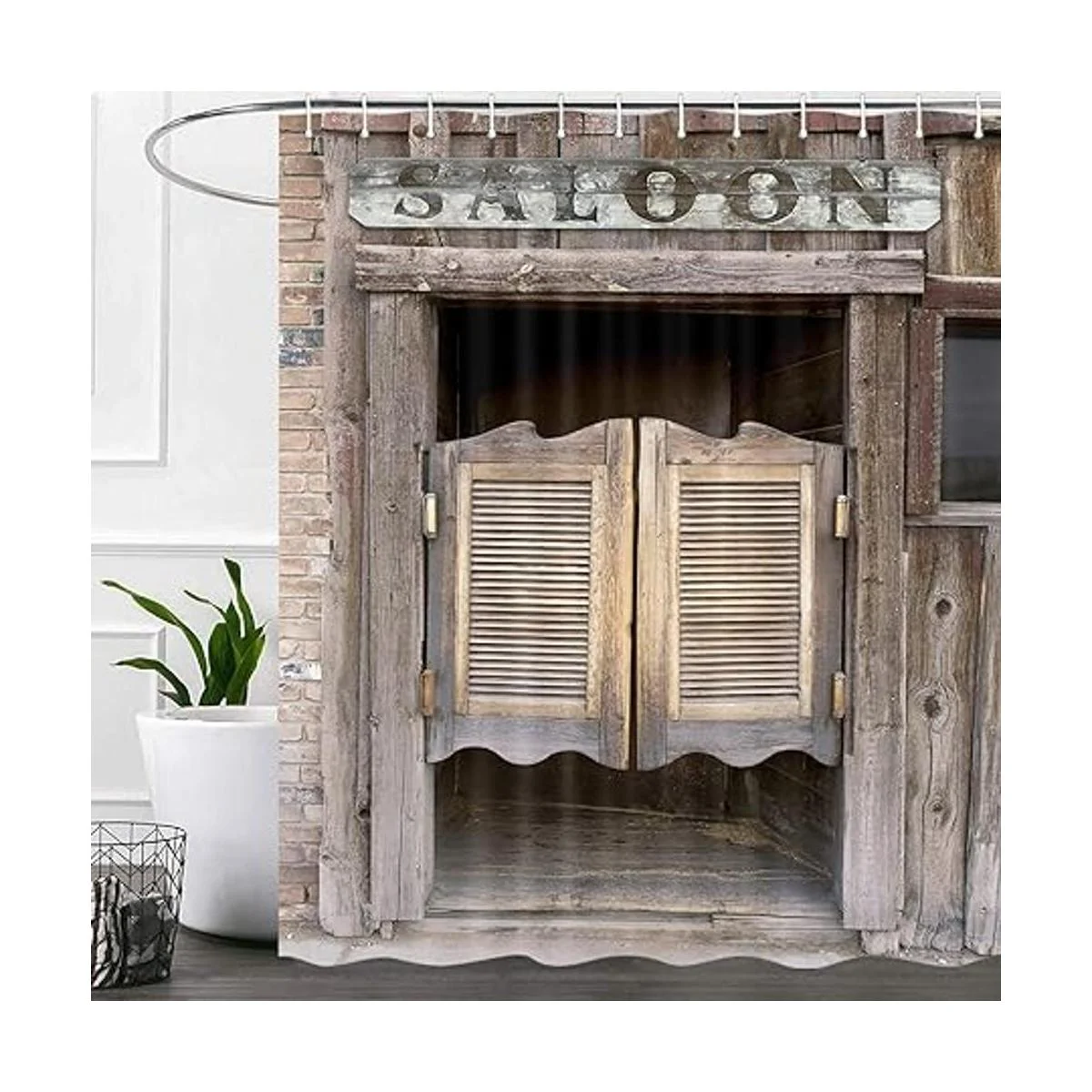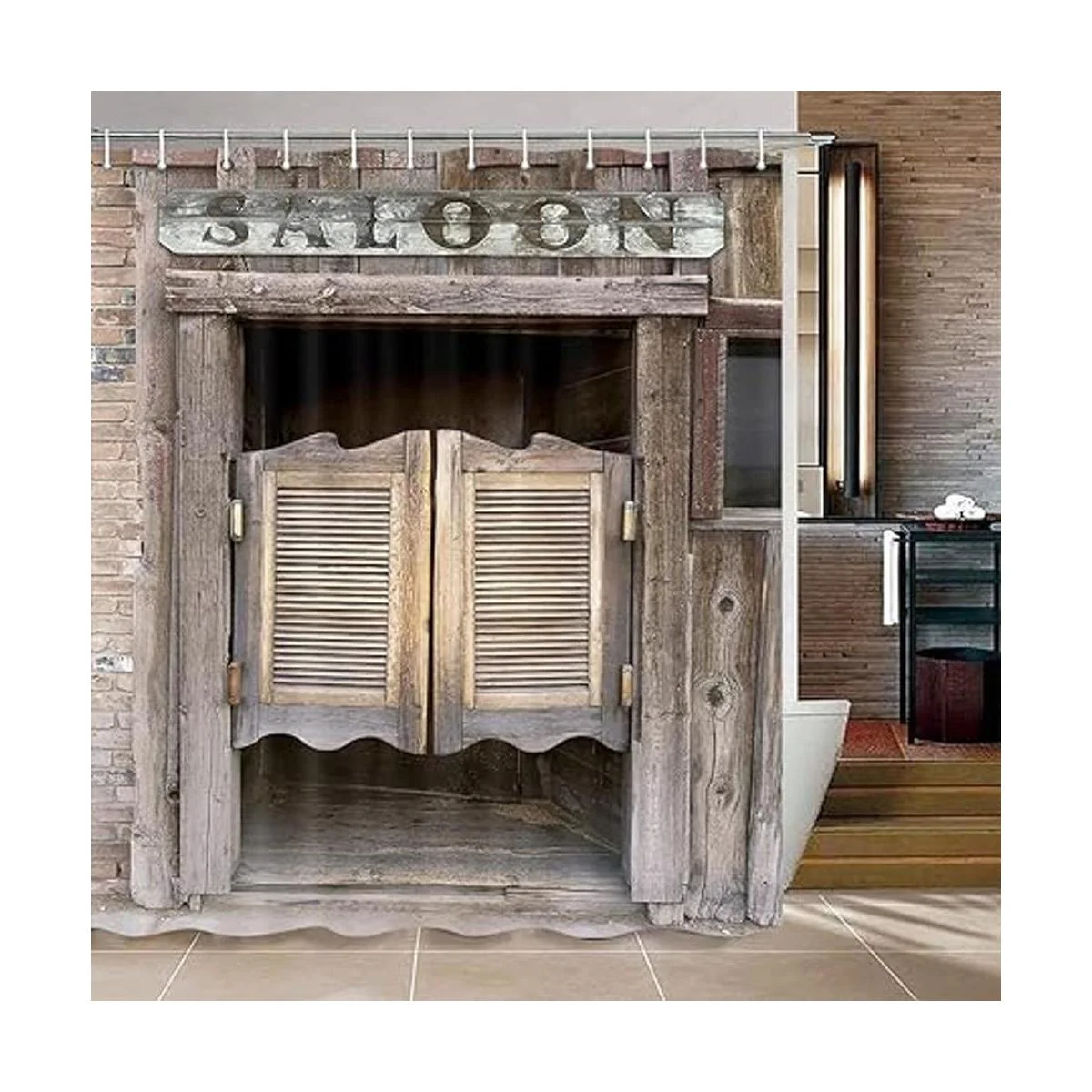 Western Cortina de ducha rústica para baño, diseño de vaquero, estilo vintage de Barndoor West Saloon de establo de tela para puerta de granero, casa rural y accesorios de baño con ganchos de 71.7 x 71.7 in