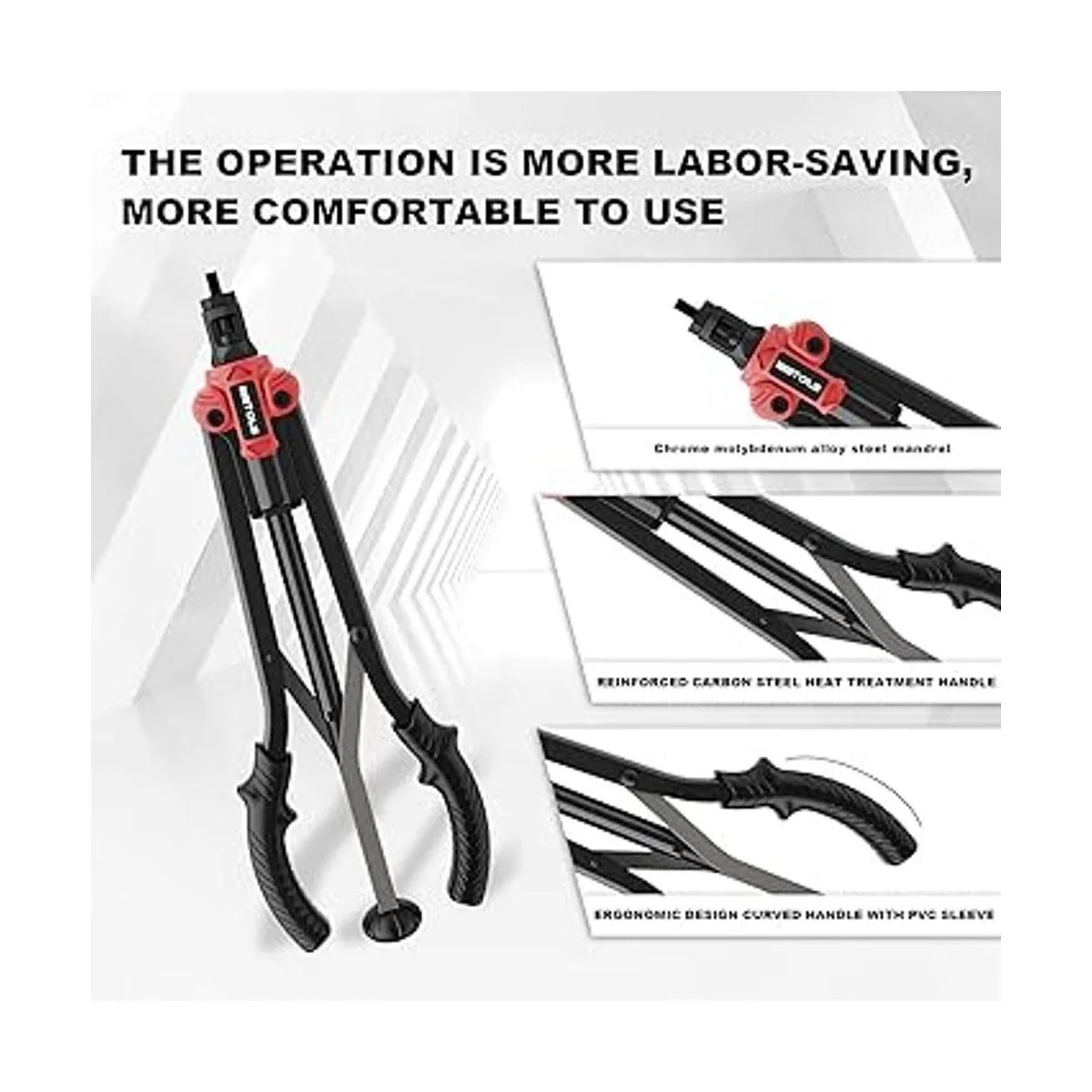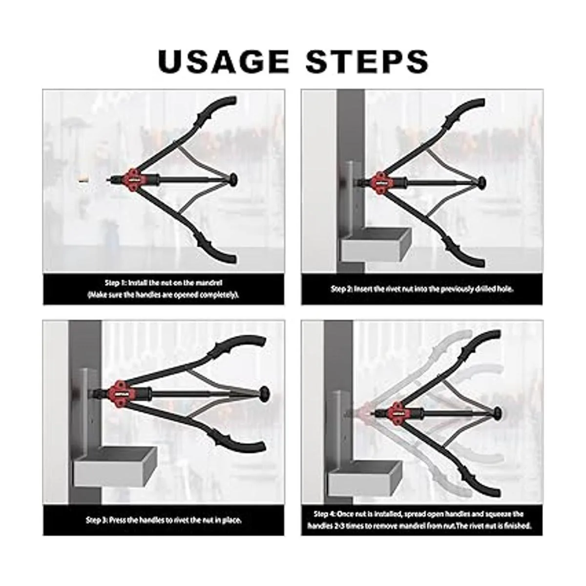 Diseño de alta calidad: asas de 17 pulgadas, máximo de múltiples brazos forzados 45; forma delicada, mano ergonómica; diseño de varilla de conexión de mango, estructura de tuerca de liberación rápida. Su diseño hace que sea más fácil remachar la tuerca. Además, cuando se completa el remache de la tuerca, el mango abierto sale automáticamente de la tuerca. No es necesario desenroscar manualmente. Ahorra mucho tiempo y hace que la operación sea simple y cómoda.