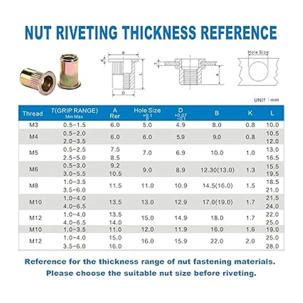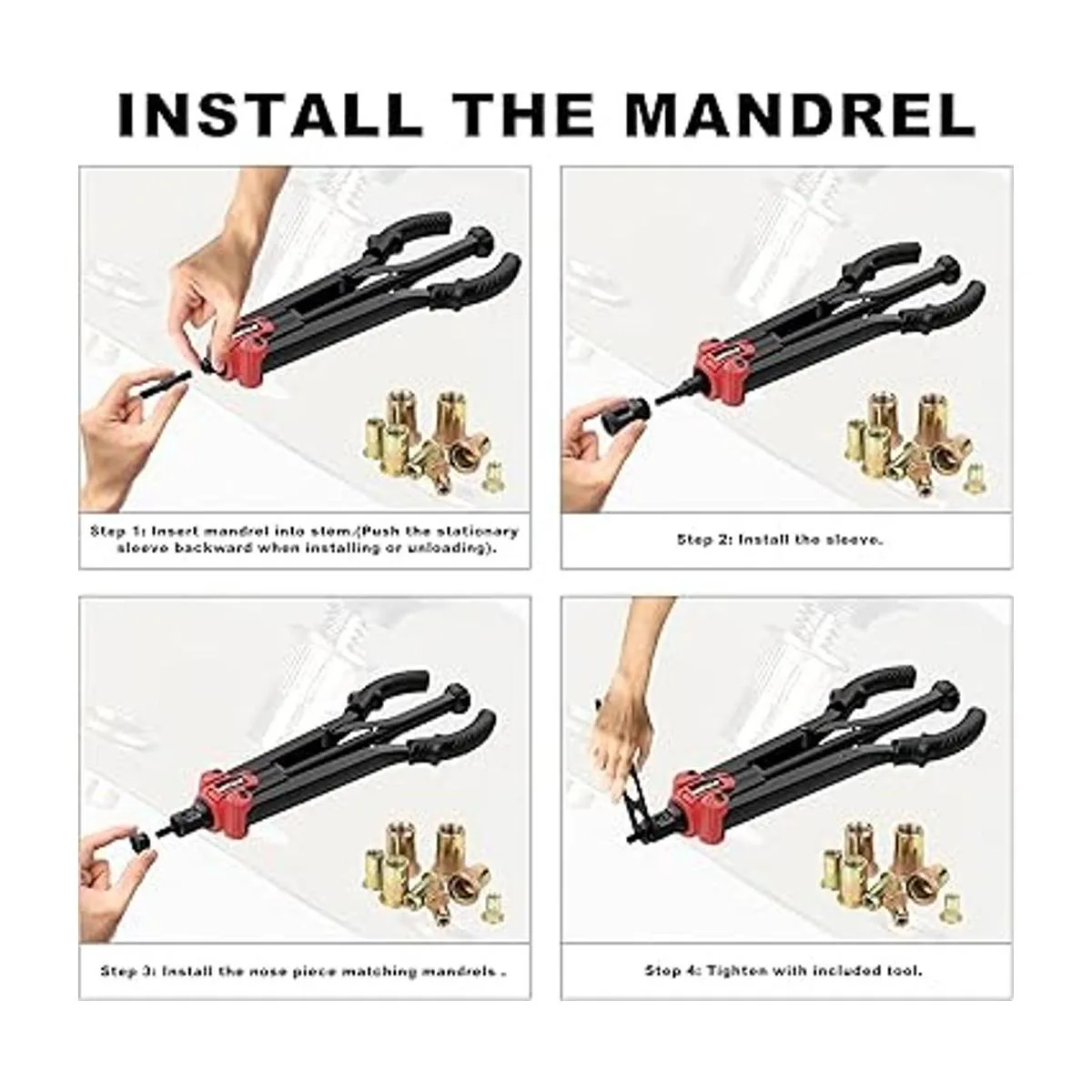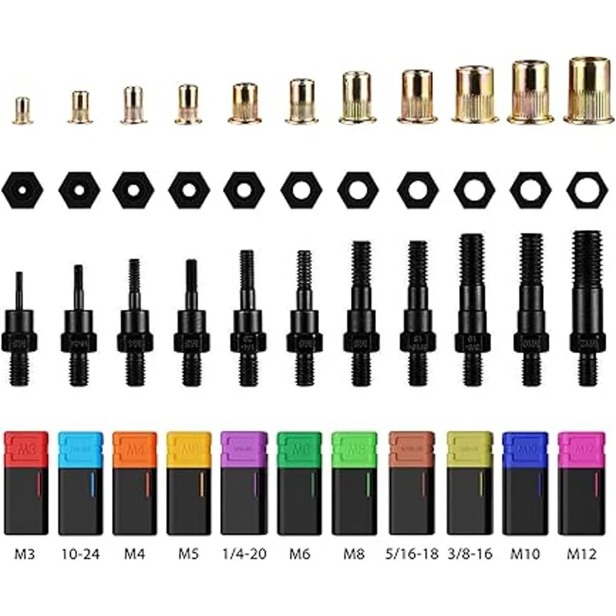 Accesorios completos: 11 mandriles intercambiables métricos y SAE métricos M3 M4 M5 M6 M8 M10 M12; SAE 1024, 1/420, 5/1618, 3/816, 110 tuercas de remache, una llave multifunción y una funda de transporte resistente. Todas las herramientas y accesorios se pueden colocar en la funda. Fácil de transportar y los accesorios no son fáciles de perder.