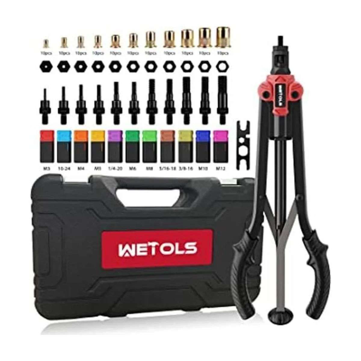 WETOLS Herramienta de tuerca de remache de 17 pulgadas, kit de herramientas de remache manual con 11 mandriles métricos y SAE M3 M4 M5 M6 M8 M10 M12, 1024, 1420, 51618, 3816, 110 remaches, estuche resistente, diseño de tuerca de liberación automática. .