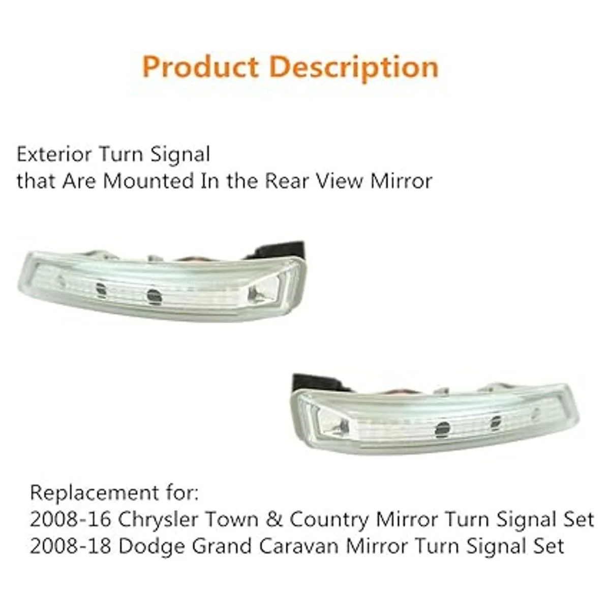 Estos reemplazarán para 20082015 Chrysler/Dodge Minivans equipados con señal de giro exterior que se montan en el espejo retrovisor