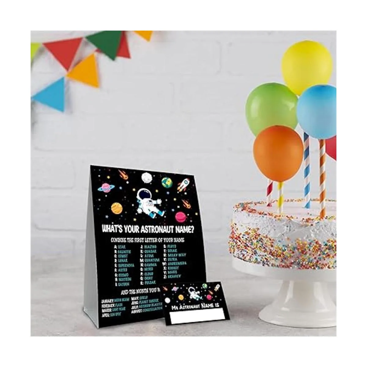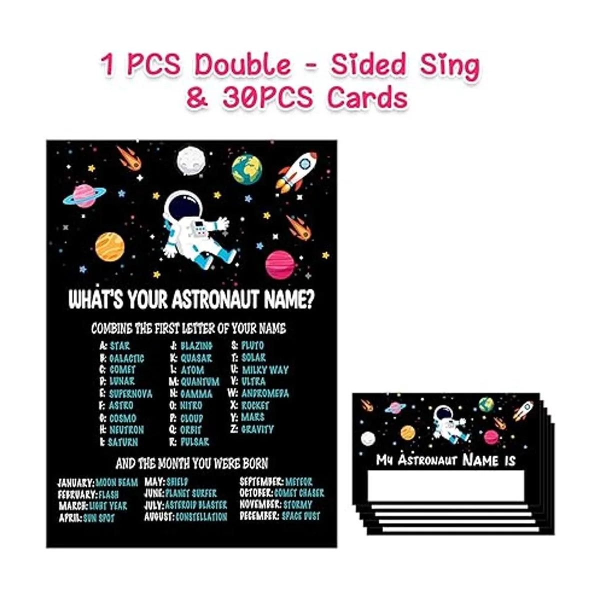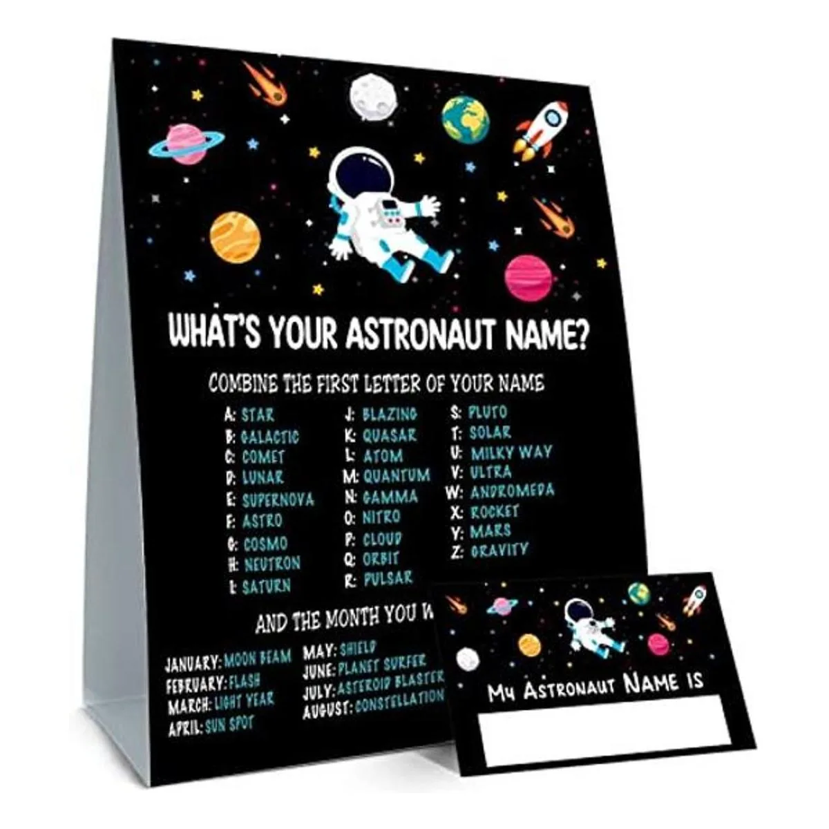 What is Your Astronaut Name Game, letrero de juego y 30 tarjetas, letrero de fiesta de cumpleaños de astronauta para niños y niñas, actividades navideñas, tarjetas de actividad de astronauta para niños, suministros de decoración de actividades de astronauta