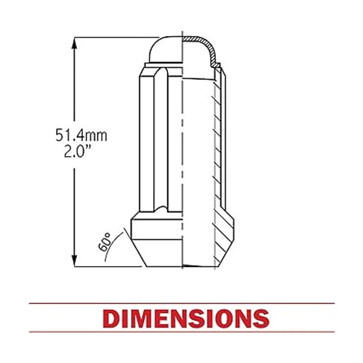 Tuerca de 2 piezas de 2 pulgadas de largo. El diseño de 2 piezas se refiere a una fina tapa de metal en la tuerca de la lengeta que protege contra lecturas de torsión falsas resultantes de que el perno de la rueda entre en contacto con el interior de la tuerca de la lengeta antes de sentarse con la rueda.