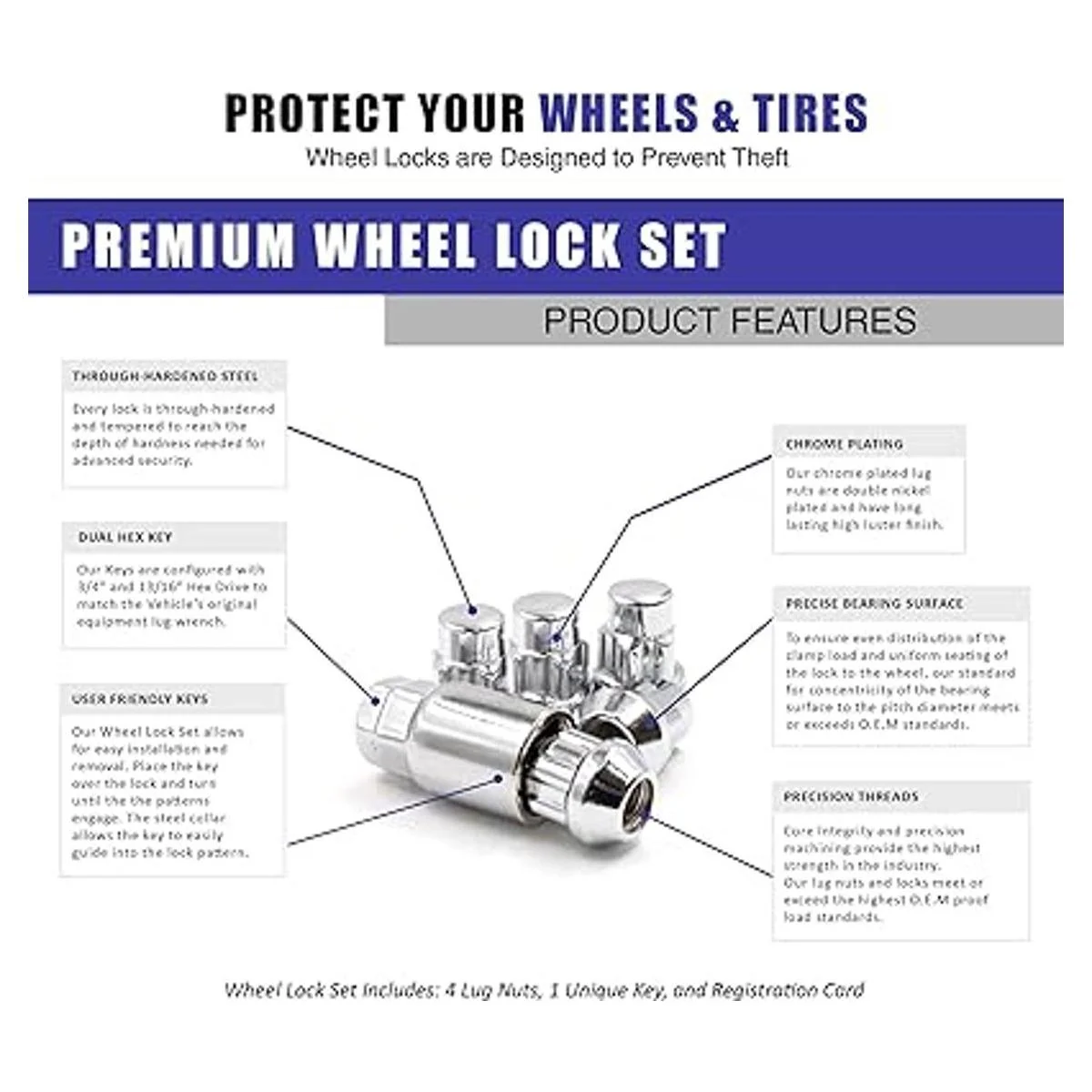 Wheel Accessories Parts Tuercas de bloqueo de rueda XL de 14 x 1.5 pulgadas, extremo cerrado de bellota, cromado, M14 x 1.5 pulgadas, tamaño de rosca de 1.86 pulgadas de largo, juego de cerraduras de rueda prémium con llave juego de 4