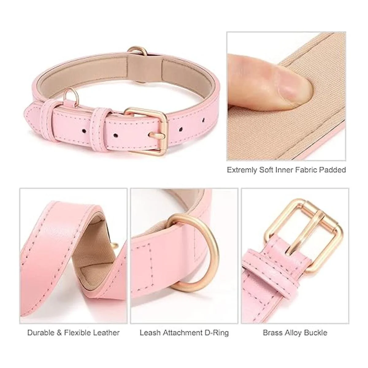 WHIPPY Collar de cuero para perros pequeños, medianos y grandes, ajustable, de cuero suave, transpirable, acolchado, con hebilla de aleación, resistente, impermeable, collar clásico para mascotas, rosa, L
