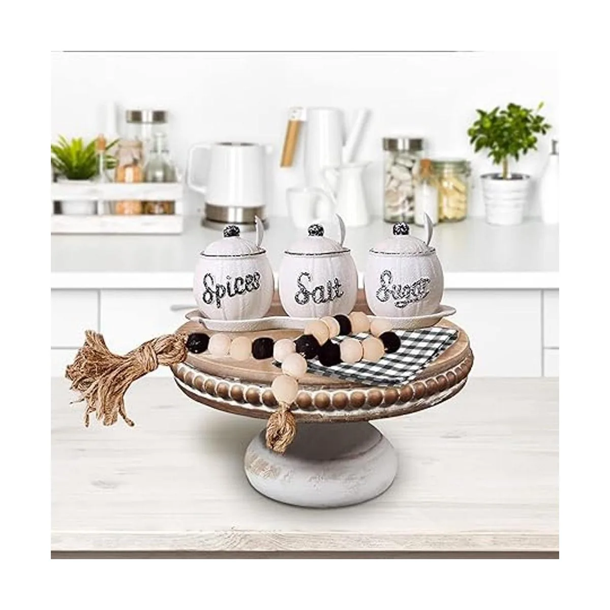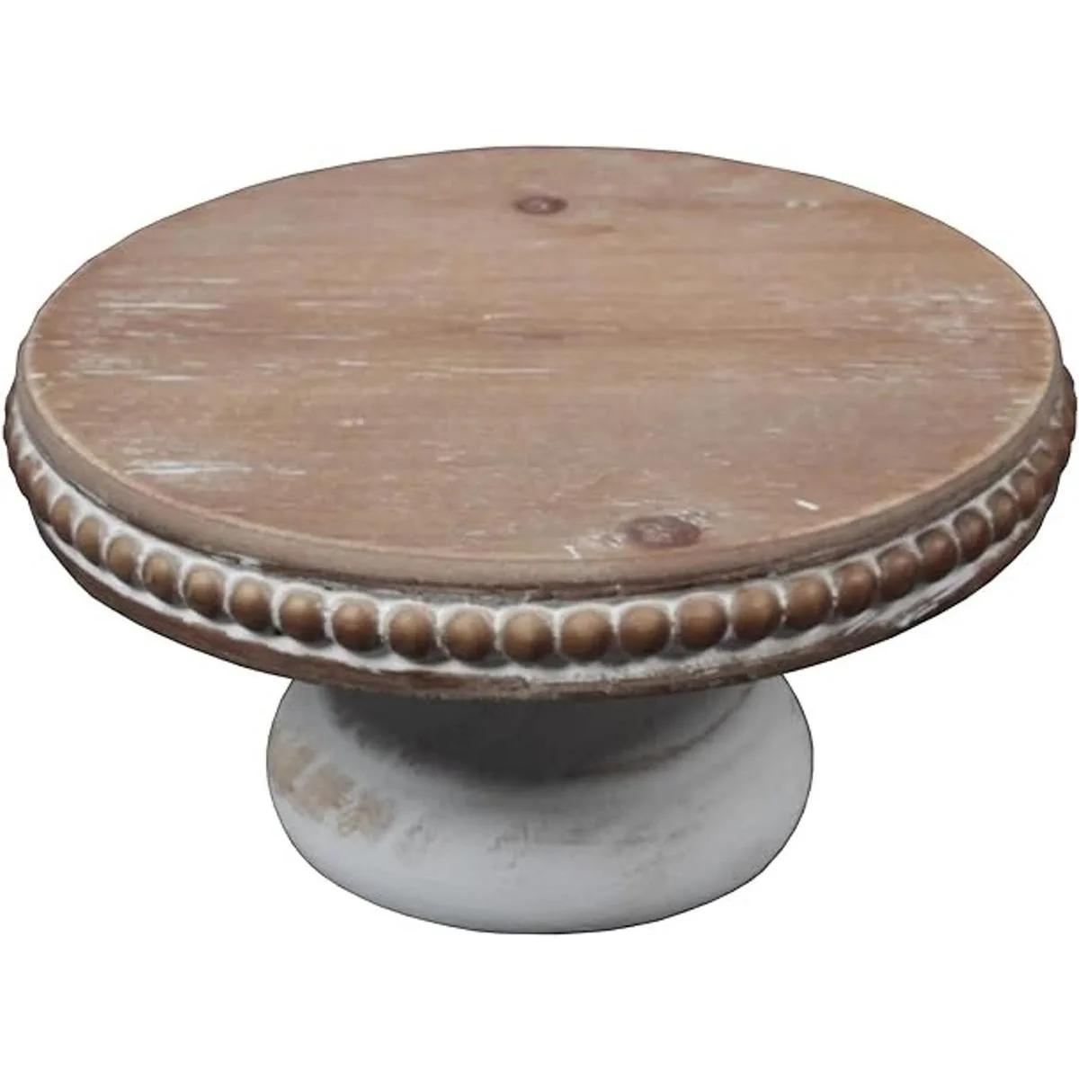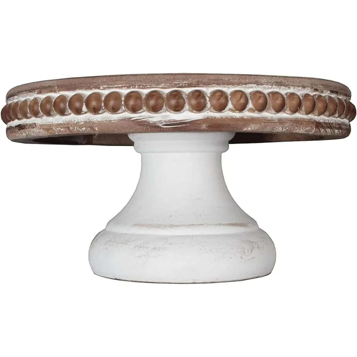 White Wash Elevador de madera con pantalla redonda, 8.25 pulgadas, decoración de bandeja de pedestal Shabby Chic con cuentas, soportes de exhibición de granja para barra de café, baño, isla de cocina