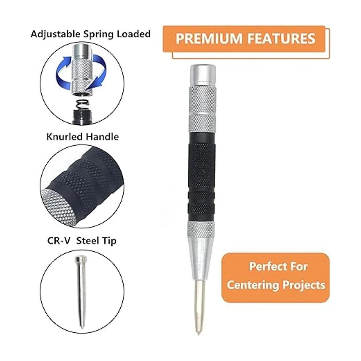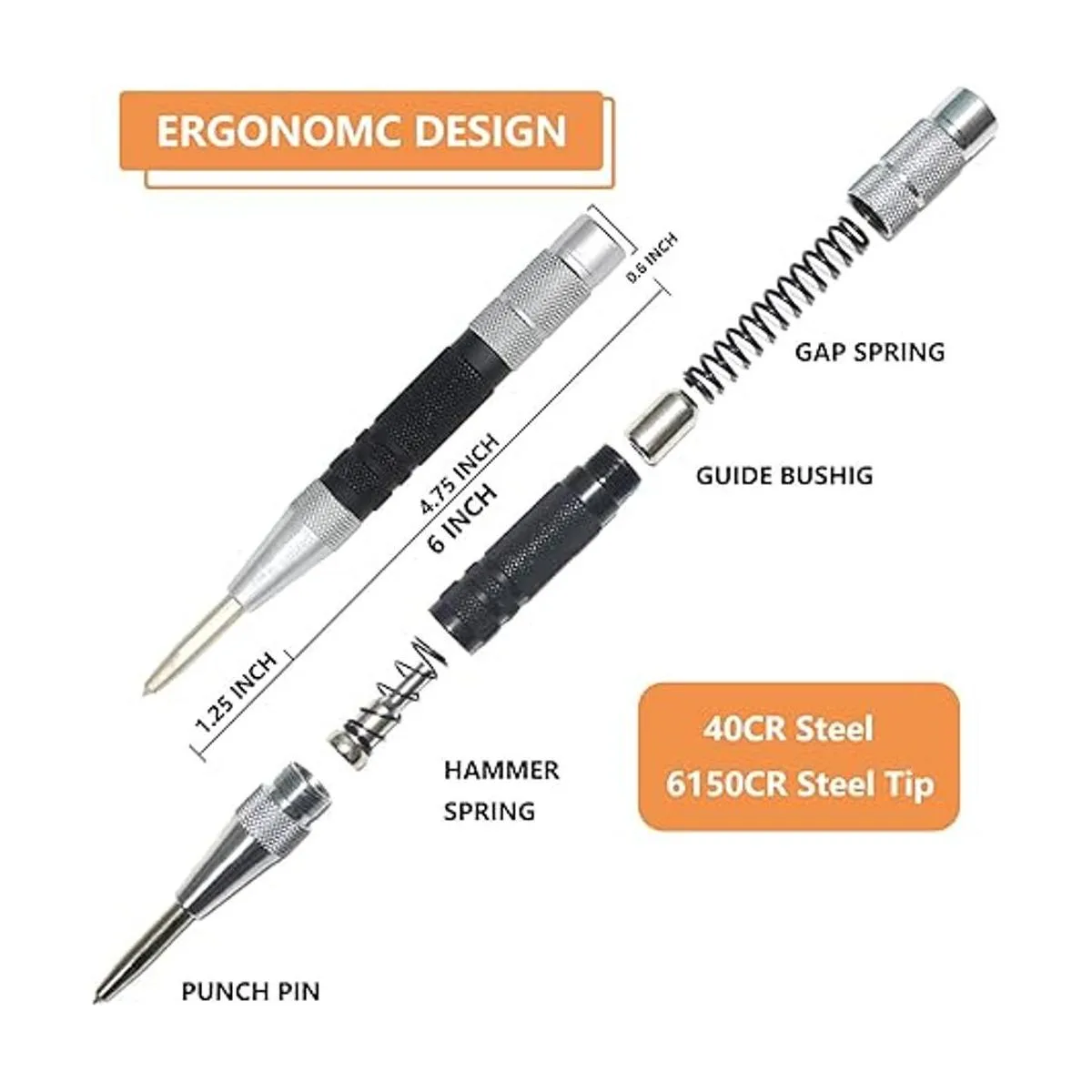 Construcción de acero endurecido: nuestro perforador central automático está hecho de acero endurecido y punta de acero 6150crv, después de un tratamiento térmico especial. Cuerpo moleteado para un buen agarre y garantizar aún más la precisión