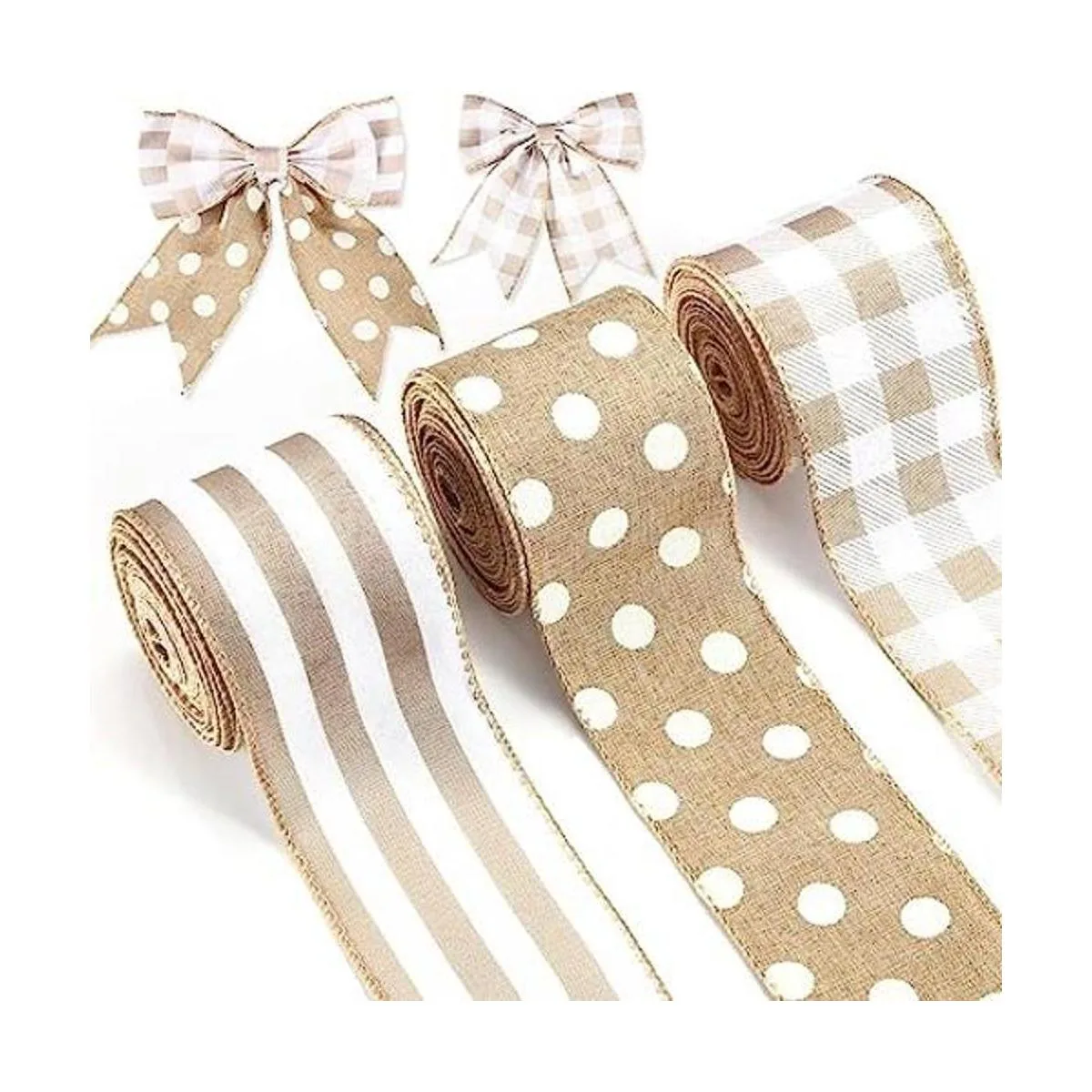 Wiaxin 3 rollos de cintas de arpillera con alambre, envoltura a cuadros, patrón de puntos de cinta de grogrén a rayas, para manualidades, fiestas, decoración del hogar, 2.5 pulgadas x 15 yardas color lino, WiaxinRibbon2055
