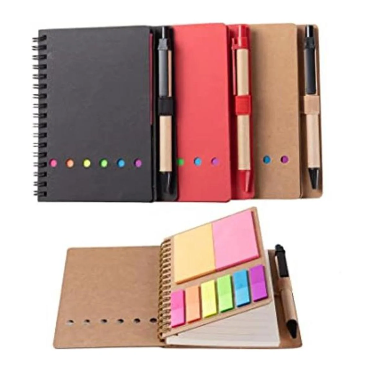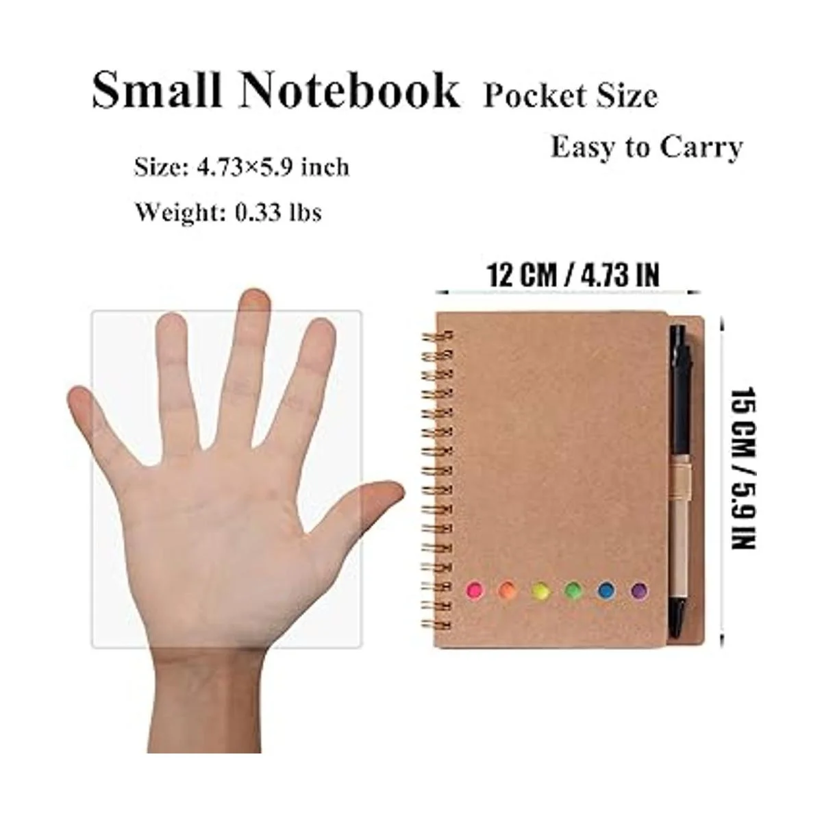 WILFANS Paquete de 3 almohadillas en espiral para cuaderno con soporte para bolígrafo, notas adhesivas, etiquetas de índice de colores, banderas de 4.73 x 5.9 pulgadas, cubierta de papel kraft de bolsillo pequeño 3 colores negrorojomarrón, 3 paquetes