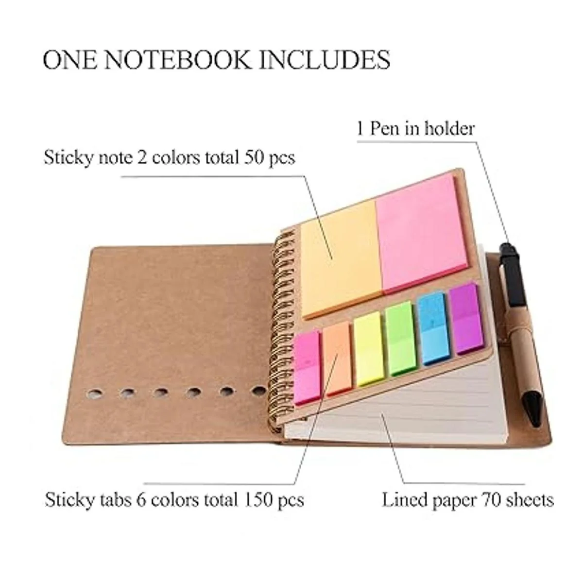 Cantidad: paquete de 3 cuadernos en espiral en total, incluye 210 hojas de papel forrado blanco, 3 bolígrafos, 75 notas adhesivas amarillas, 75 notas adhesivas rosadas y 6 colores de páginas adhesivas 75 piezas de cada color, más cantidad es más rentable.
