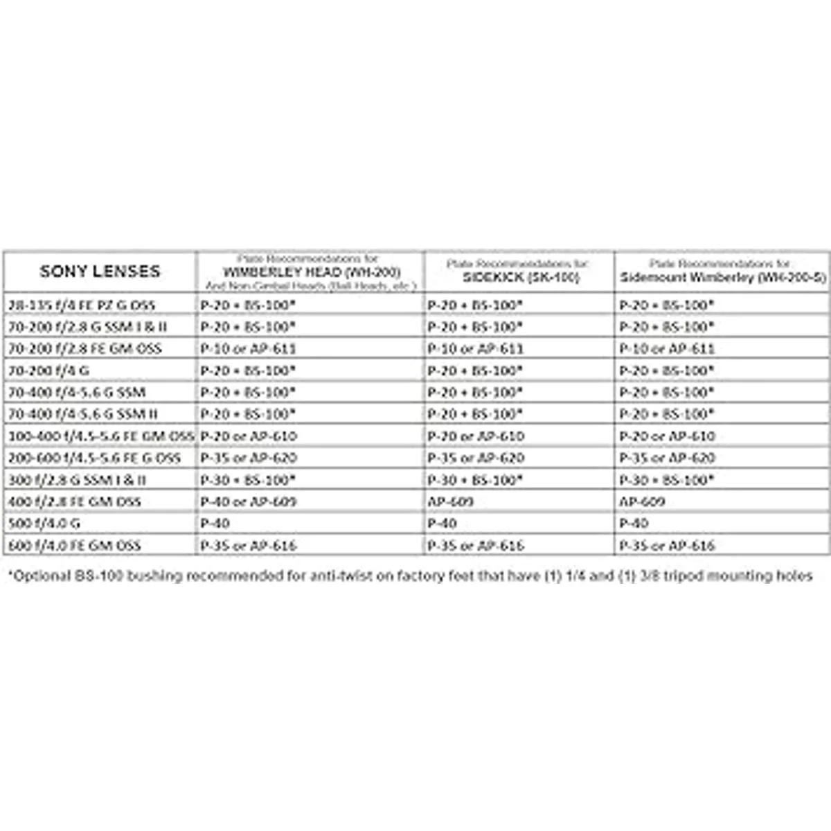 Wimberley AP620 Pies de repuesto para objetivo Sony 200600 G OSS, estilo permanente, estilo ArcaSwiss, fabricado en Estados Unidos