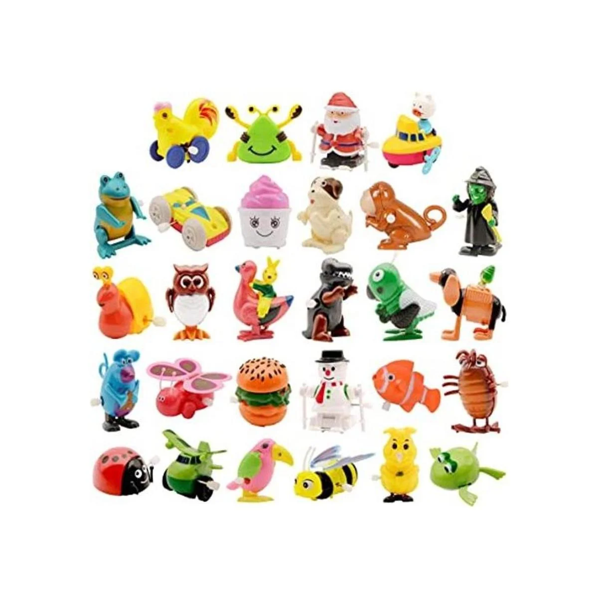 juguetes de cuerda medir sobre 2 inch, incluyendo dinosaurio, Papá Noel, mariposa, hamburguesa, monos, peces, helado, avión, búho, mouse y cangrejo, etc.