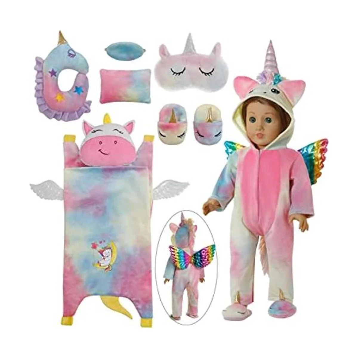 Windolls American Juego de saco de dormir y accesorios de ropa para muñeca de 18 pulgadas, disfraz de unicornio con saco de dormir estilo unicornio, máscaras de ojos, almohada, pantuflas, se adapta a My Life, Generation, Journey Dolls