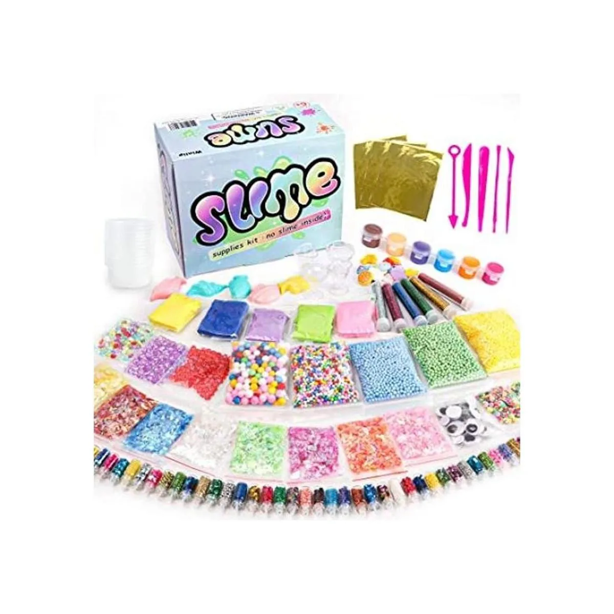 WINLIP Kit de suministros de limo, paquete de 162 unidades para la fabricación de limo para niños y niñas, incluye bolas de espuma, purpurina, cuentas de pecera, encantos, recipientes transparentes