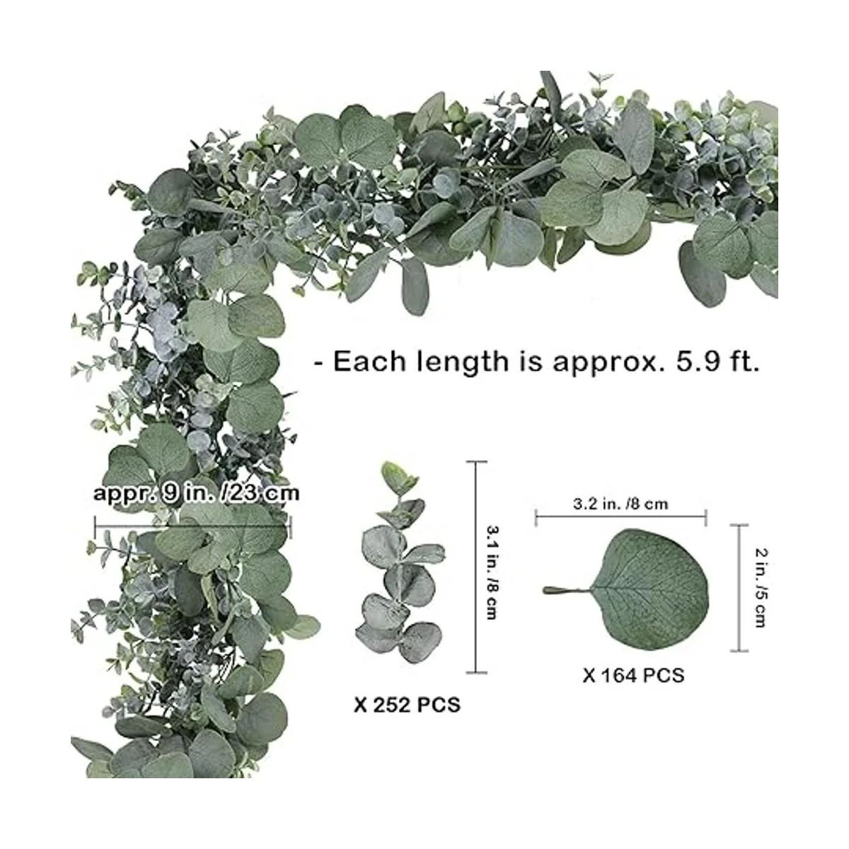 Tamaño: la guirnalda de eucalipto de plata falsa es de 6 pies de largo, 5.9 pulgadas de ancho. Las hojas son de aproximadamente 2.1 pulgadas de largo x 1.9 a 2.2 pulgadas de ancho. La guirnalda de hojas de eucalipto artificiales es de aproximadamente 5.9 pies de largo, 7.9 pulgadas de ancho. Estas son guirnaldas gruesas y completas que se ven reales y son una impresionante adición a cualquier decoración de boda o hogar.