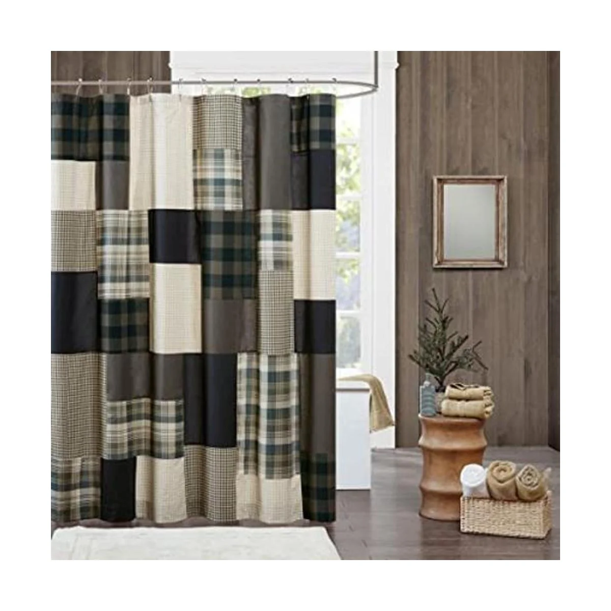 Esta cortina de ducha de algodón ligero de 144 hilos cuenta con varios cuadros diferentes y sólidos unidos para el equilibrio perfecto en este aspecto de cabaña.