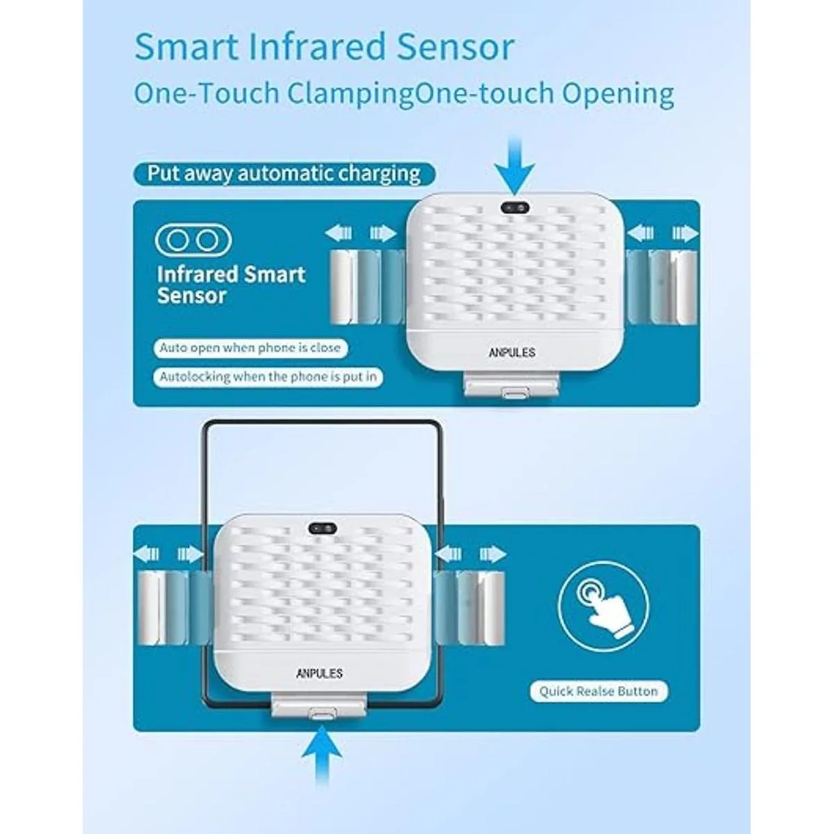 Infrared induction Charger Stand 2 in 1 wireless charging station adopts the newly upgraded infrared induction technology. Once the wireless charger detects that the mobile phone is placed on the bracket, the arm will open automatically. Wireless charger stand will automatically clamp and keep the phone charging. Gently touch the button below the wireless charger to open the arm if you want to remove the phone.