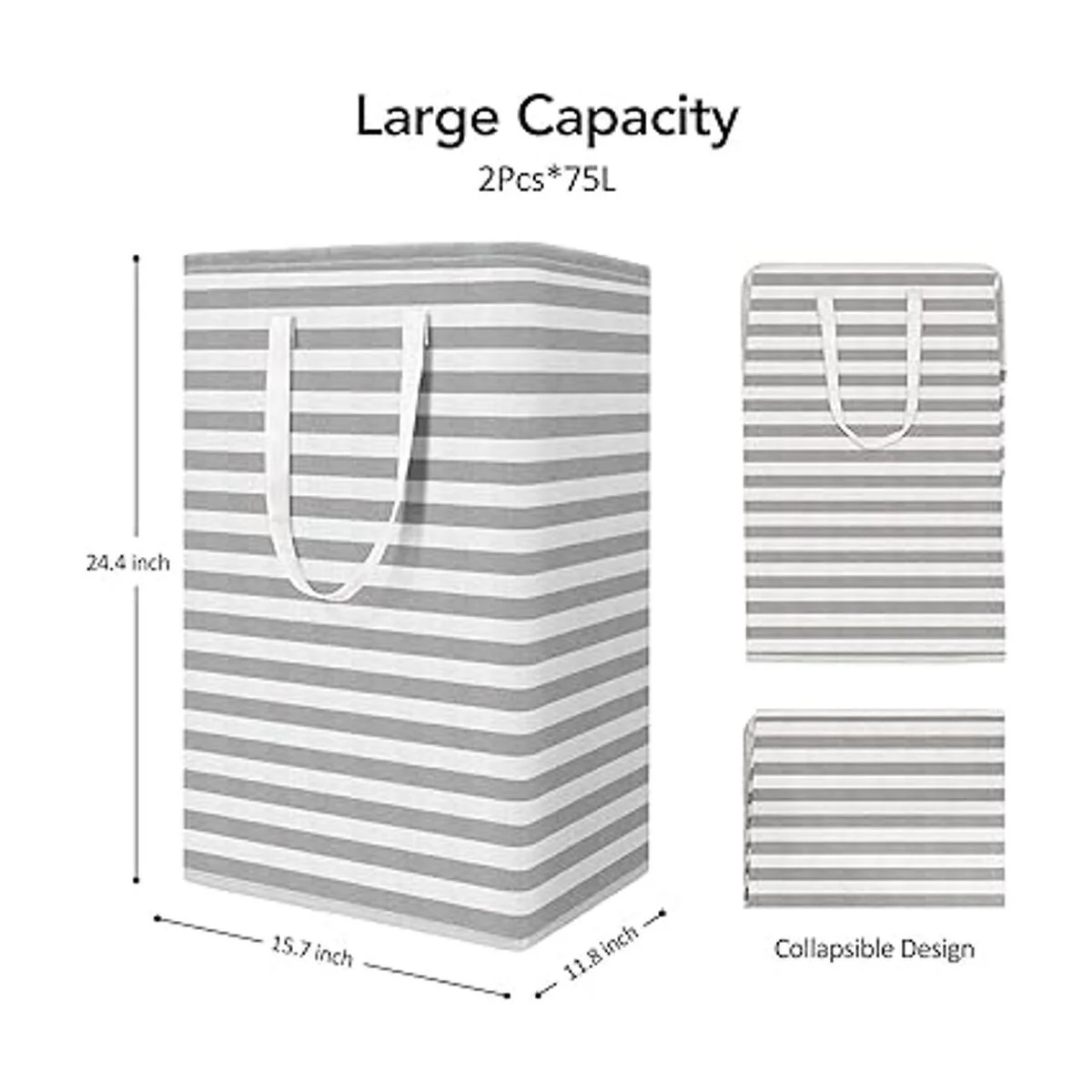 Gran capacidad La cesta de lavandería WISELIFE con las dimensiones de 11.8 pulgadas de largo x 15.7 pulgadas de ancho x 24.4 pulgadas de alto tiene una gran capacidad de 75 litros. Un juego incluye 2 cestas de lavandería que pueden proporcionar más capacidad para almacenar y organizar mejor tus artículos.