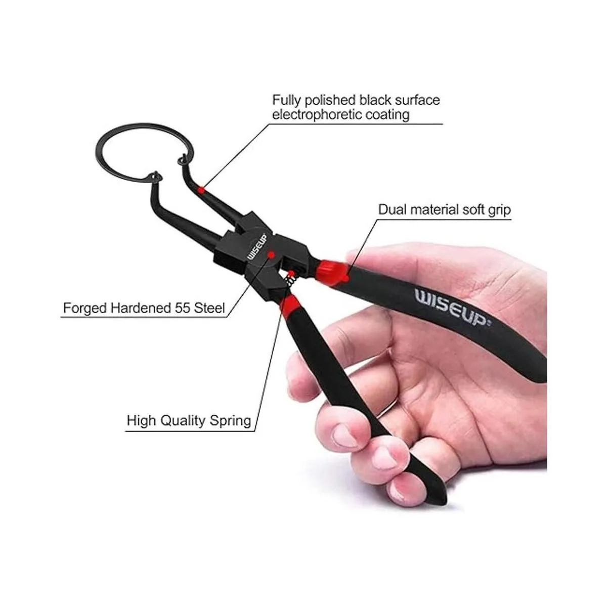 Material de alta calidad: los alicates de anillo a presión de WISEUP están hechos de acero al carbono 55 de grado industrial que tiene alta dureza y resistencia después de forjar y tratar térmicamente. Vienen con película protectora de óxido que hace que los alicates de clip en C sean resistentes, duraderos, anticorrosión y larga vida útil