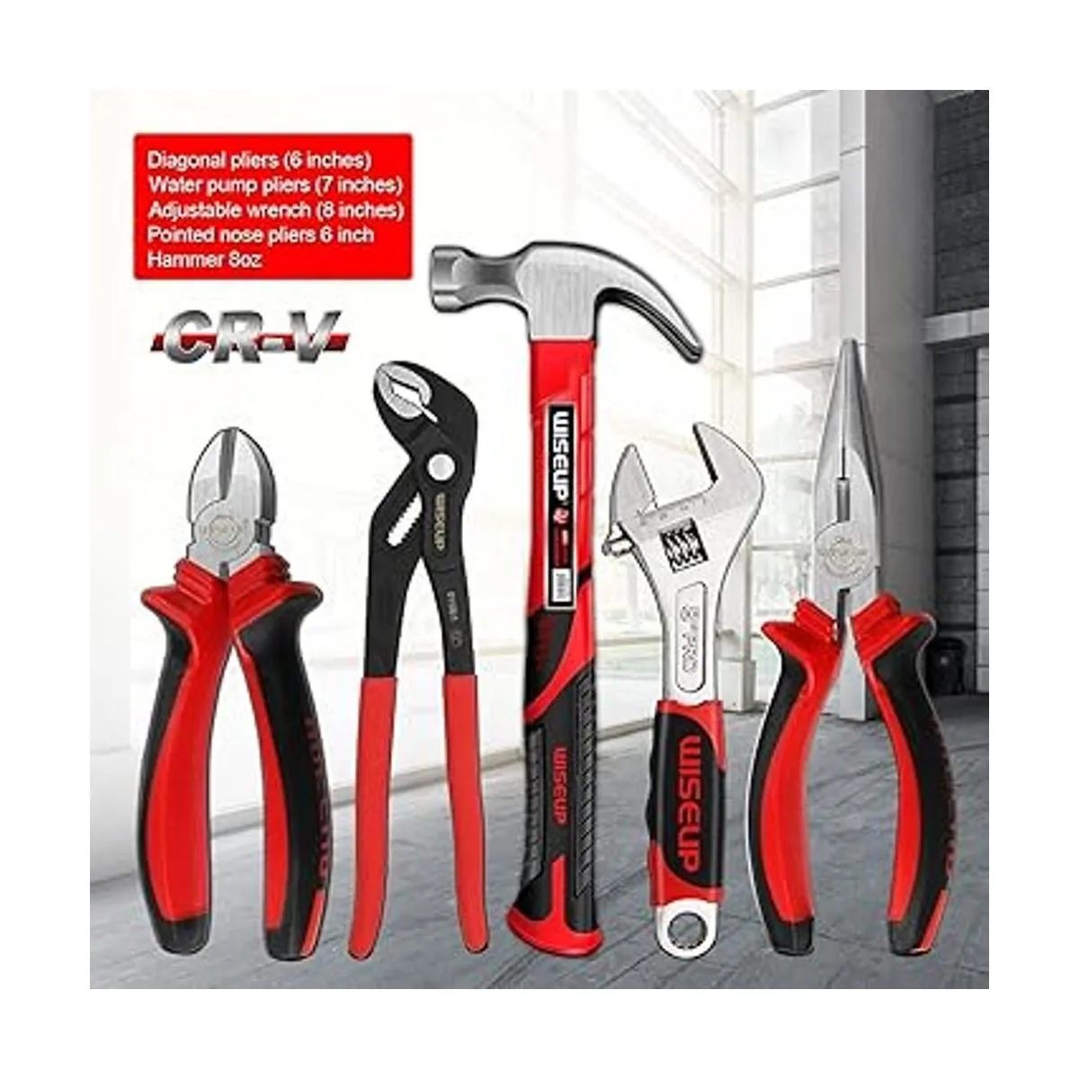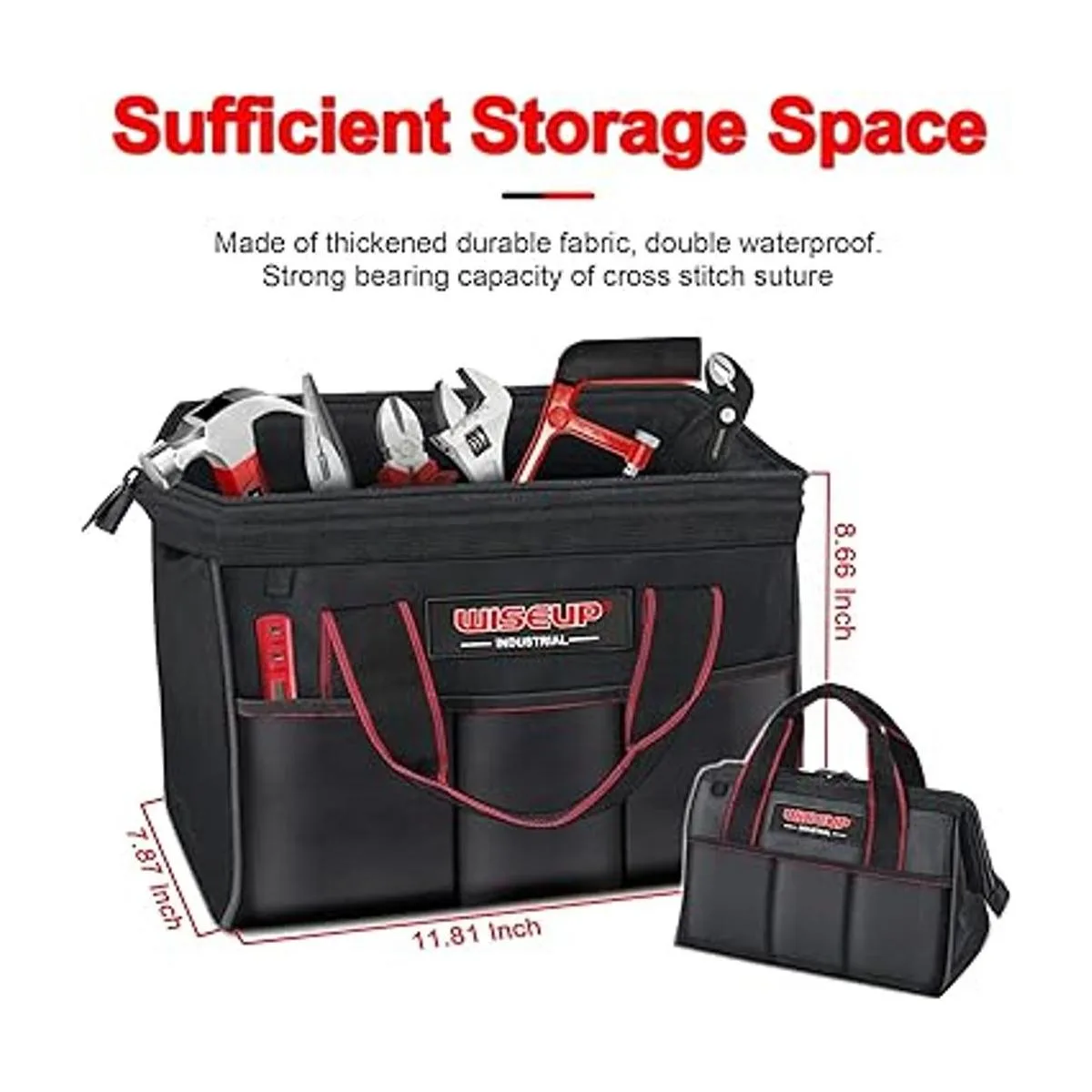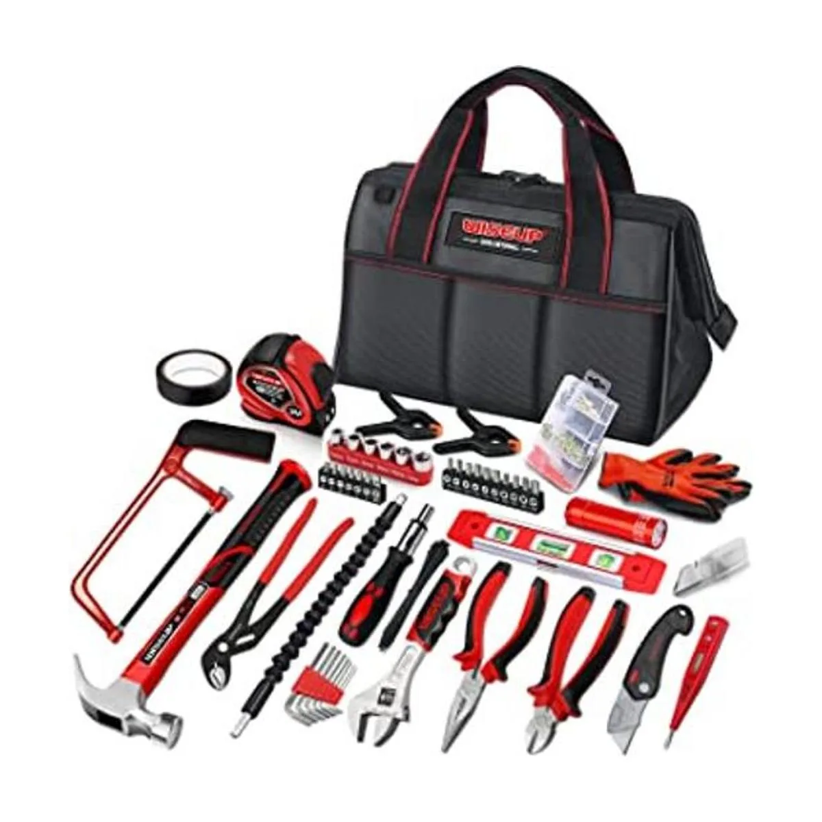 WISEUP Juego de herramientas para hombres y mujeres resistente, kit de herramientas básicas para el hogar para reparación del hogar, bricolaje, carpintería con boca ancha de 10 pulgadas de ancho, bolsa de almacenamiento cálida para regalo de casa