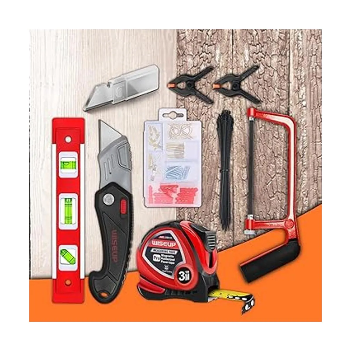 Kit de herramientas básico: este juego de herramientas incluye todas las herramientas más útiles y necesarias para el mantenimiento del hogar y el uso diario. Contenido de linterna, martillo, nivel, cinta métrica de bloqueo automático, alicates, destornilladores y brocas, llaves, cuchillo utilitario y cuchillas SK5, llaves hexagonales y kit de herramientas
