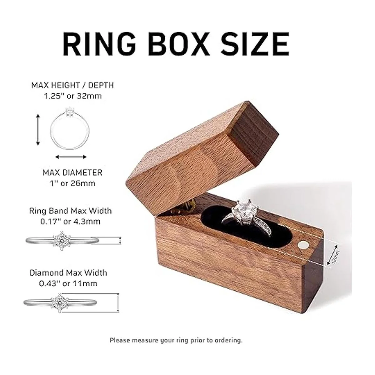 Alta calidad: hecho de una pieza entera de madera de nogal e inserto de terciopelo negro para mejorar completamente tu anillo