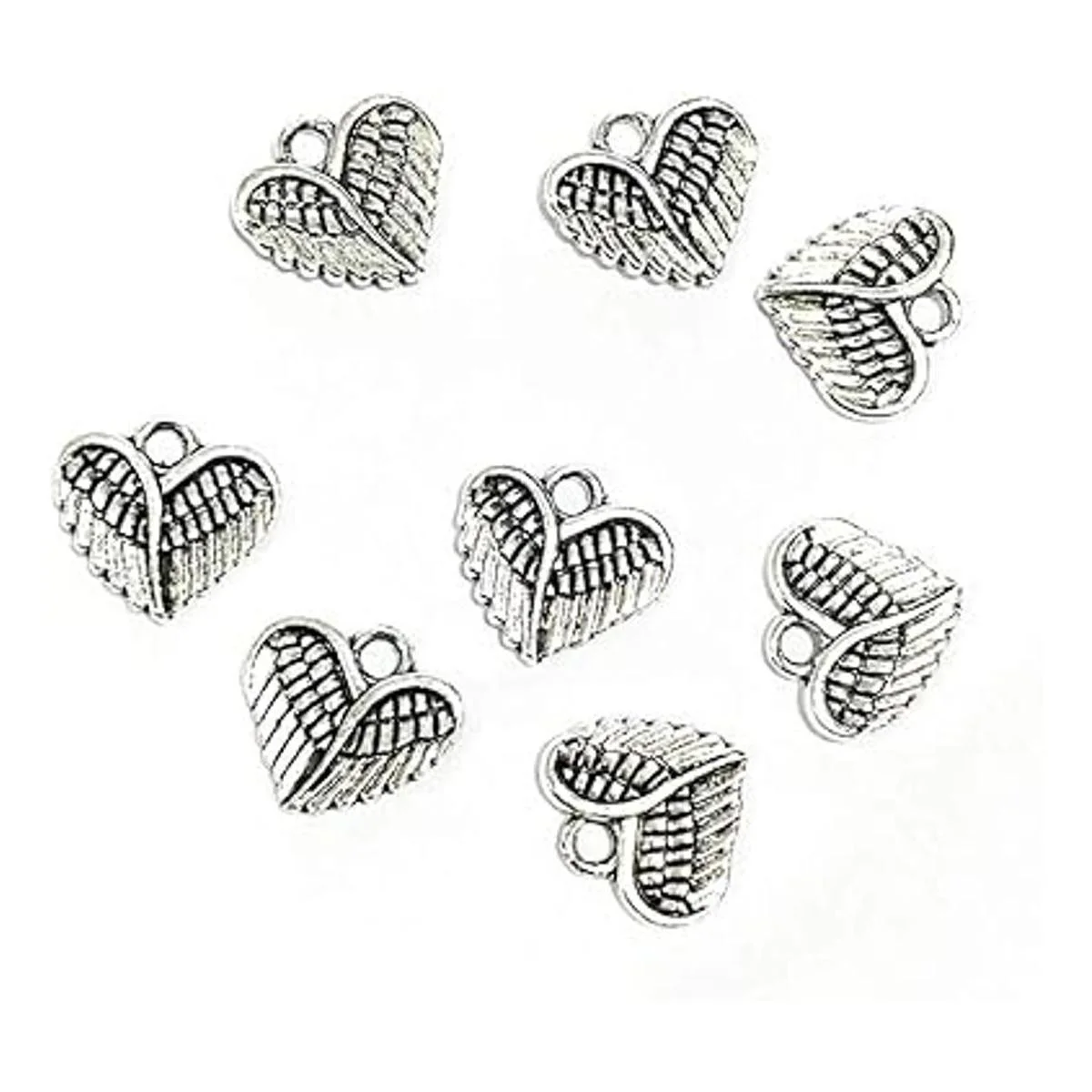 Wixine 100 cuentas con colgante de corazón de alas de ángel para bebé, color plateado envejecido