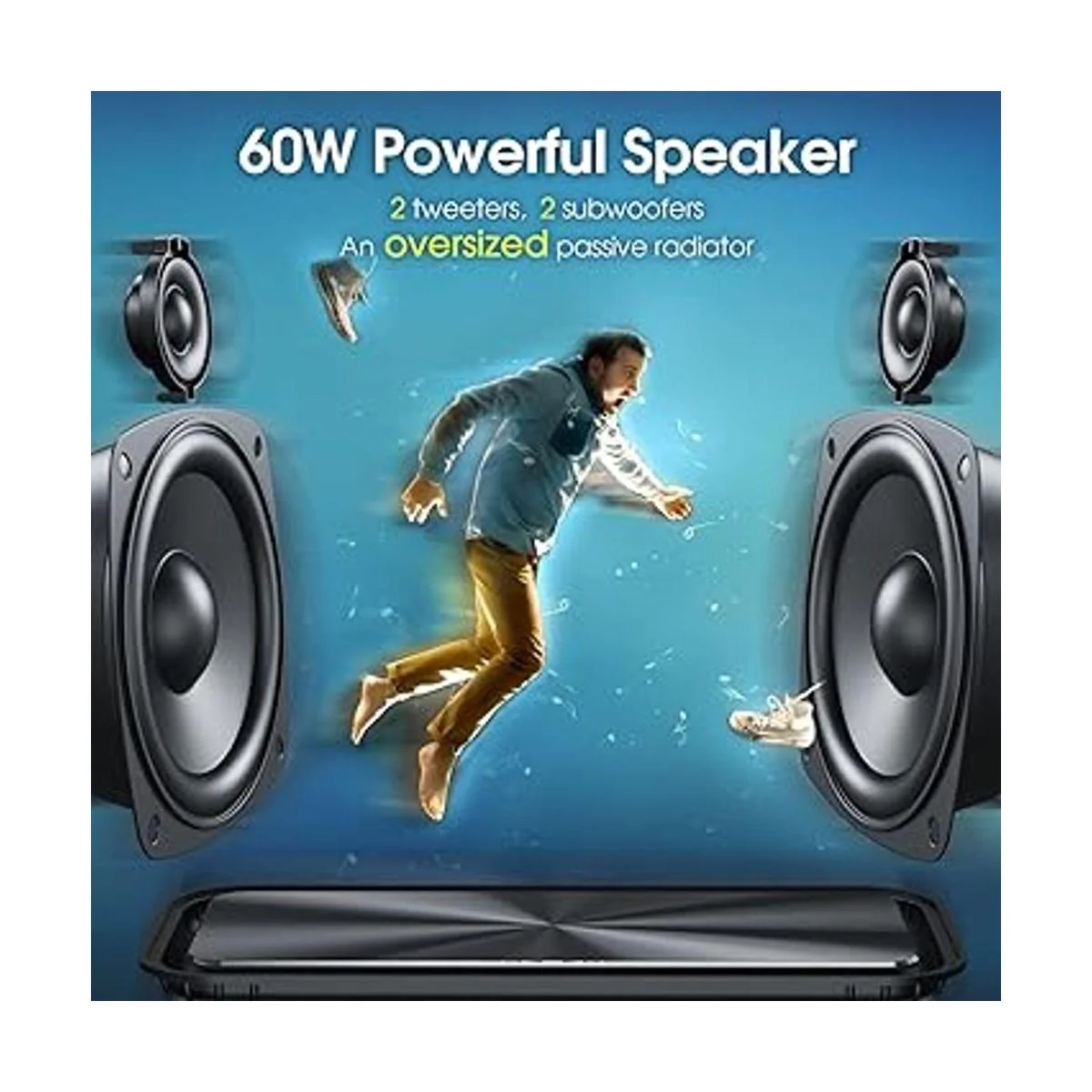 Serie D91 integrada de radiador de graves pasivo grande y extraordinario sonido HD de 60 W. El altavoz Bluetooth D91 también está equipado con 60 W RMS 80 W pico, woofers duales increíblemente fuertes, tweeters duales y un gran radiador de graves pasivos, tecnología DSP avanzada integrada, transmisión de audio de energía fuerte continua, tiempo para que puedas crear un ritmo claro y fuerte, trae una escucha inmersiva experiencia. El módulo Bluetooth 5.0 integrado se conecta fácilmente a todos los dispositivos habilitados para Bluetooth dentro de 33 pies.