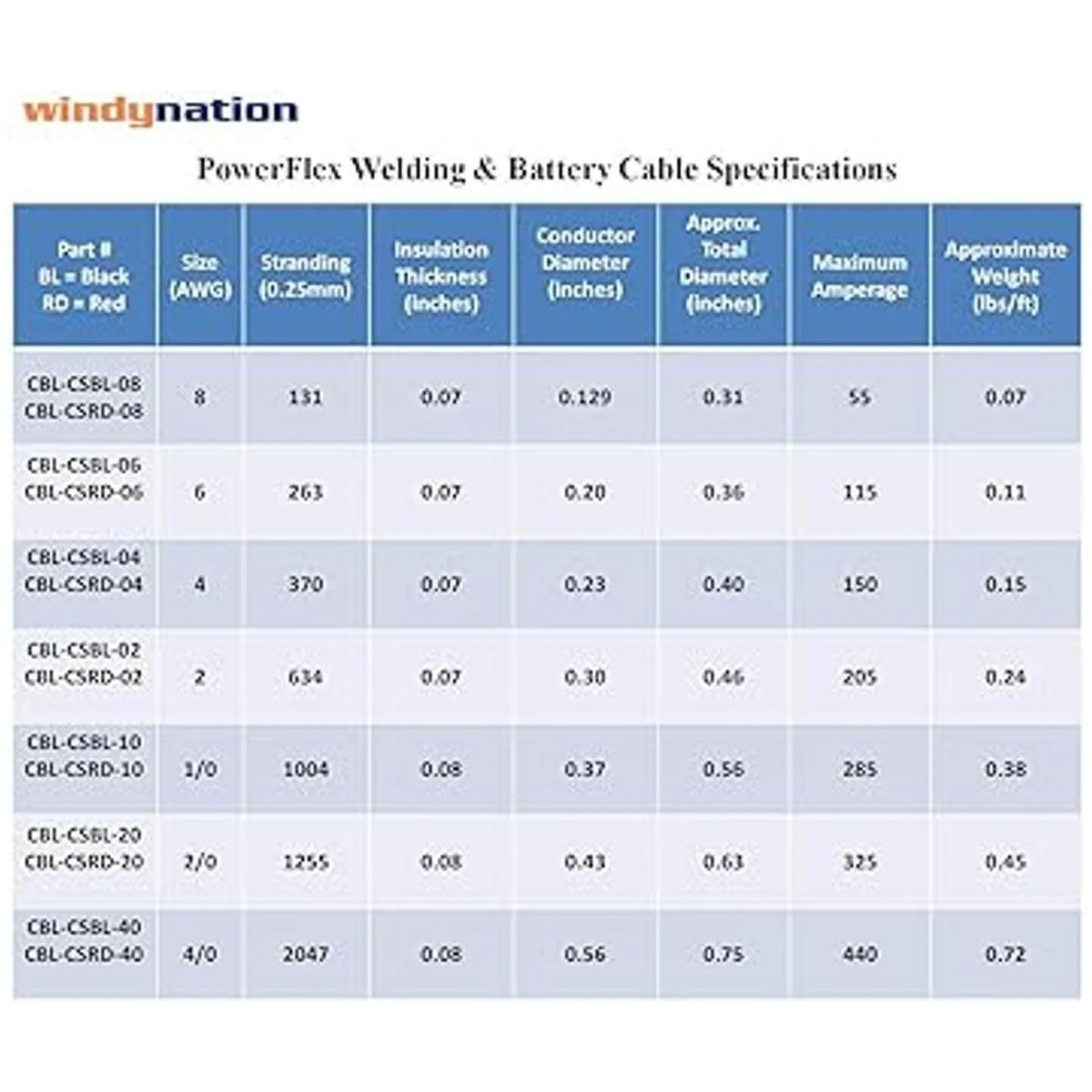 Made in the USA WindyNation Power Flex Cable is an ultra flexible PURE copper cable manufactured with a tough, solvent resistant EPDM insulation jacket. PLEASE SEE THE PHOTO GALLERY FOR A CABLE SPECIFICATION CHART amperage, voltage, stranding, insulation and copper thickness, etc.
