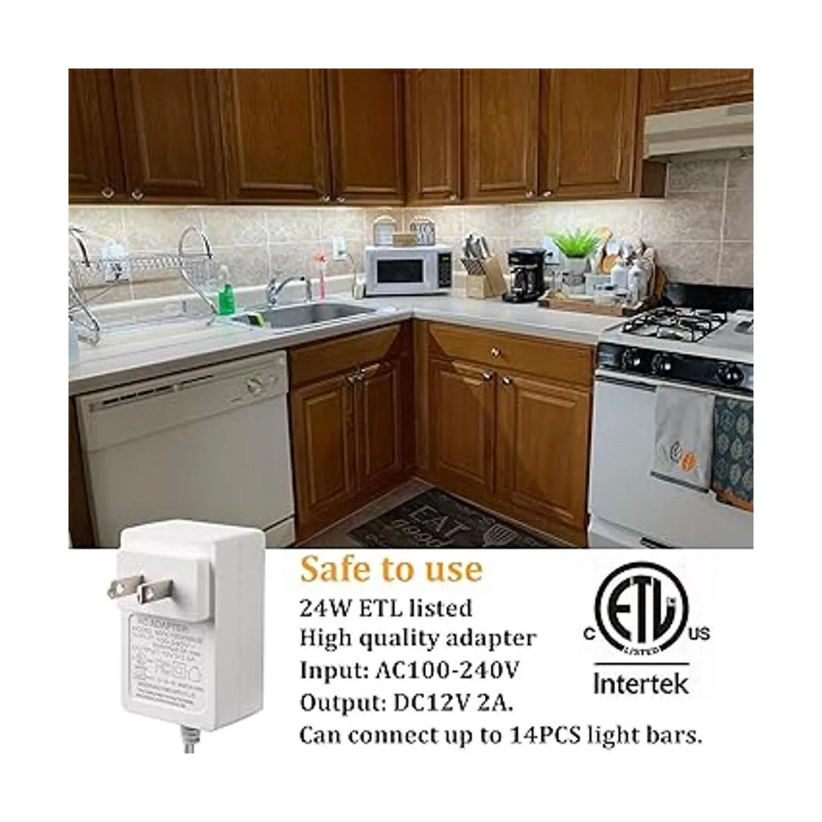 Kit fiable: adaptador de alta calidad y tira de luz. El voltaje de trabajo de la cinta LED es de 12 V CC, extremadamente bajo voltaje y calor, el enchufe de 24 W se puede conectar hasta 14 barras de luz total de 23 pies
