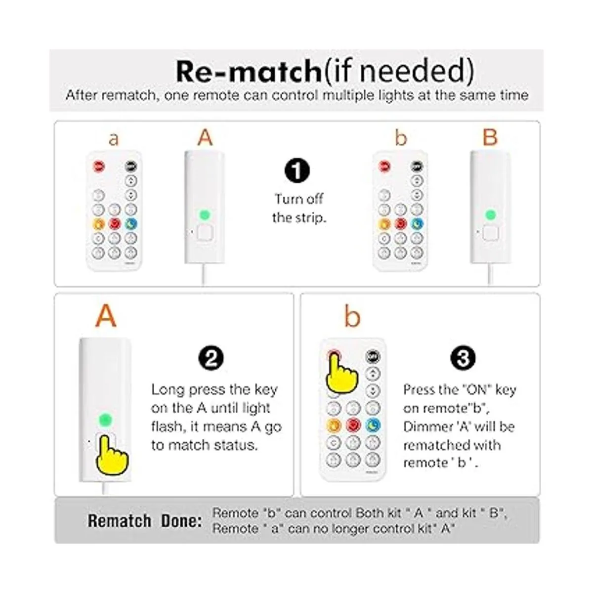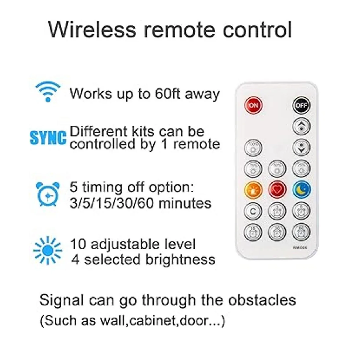 Control remoto inalámbrico RF: el control remoto RF de 17 teclas tiene temporización, atenuación, botones calientes, repetición y función dinámica, distancia de control de 60 pies