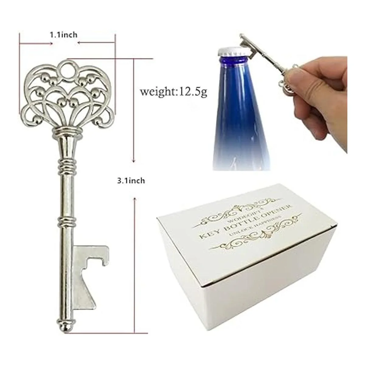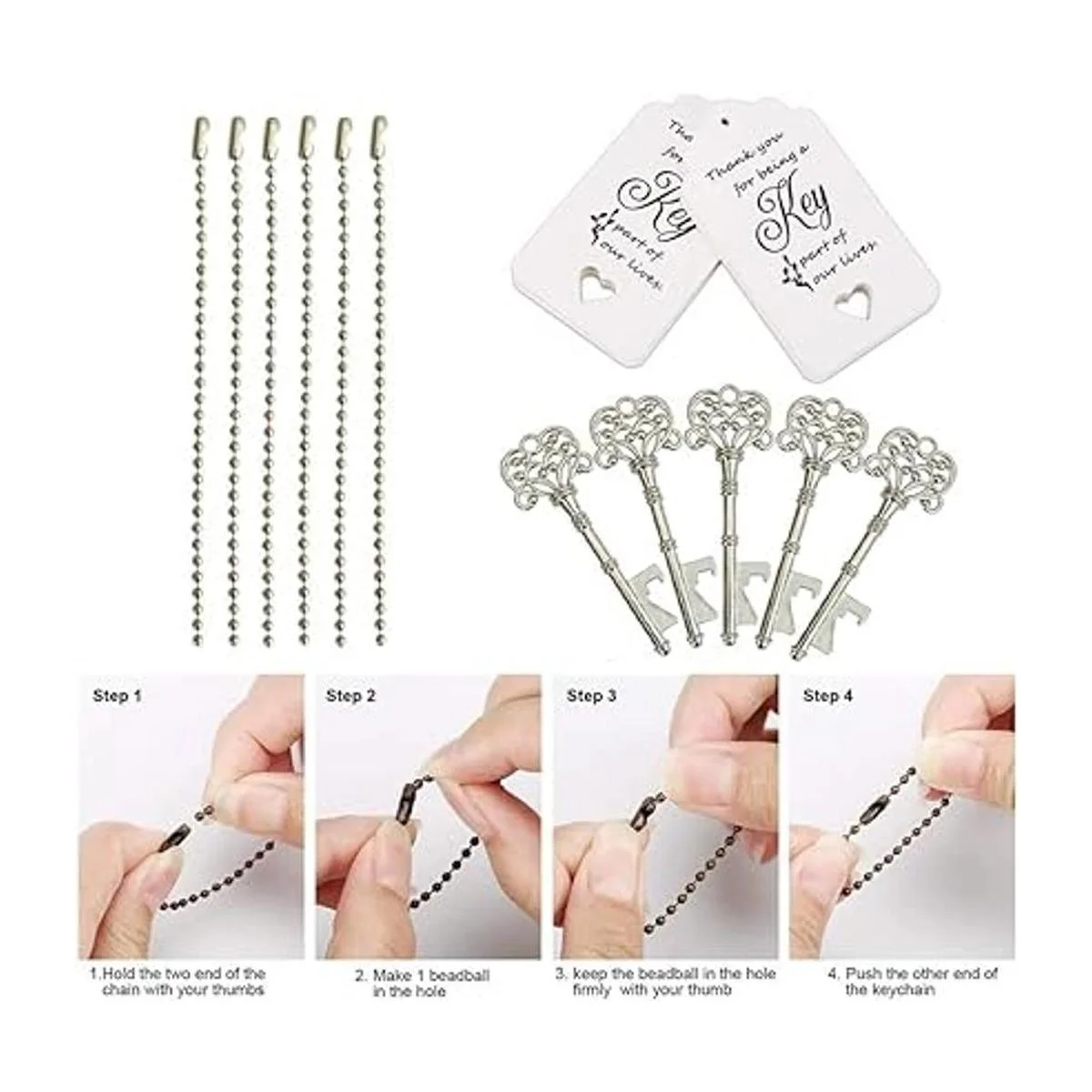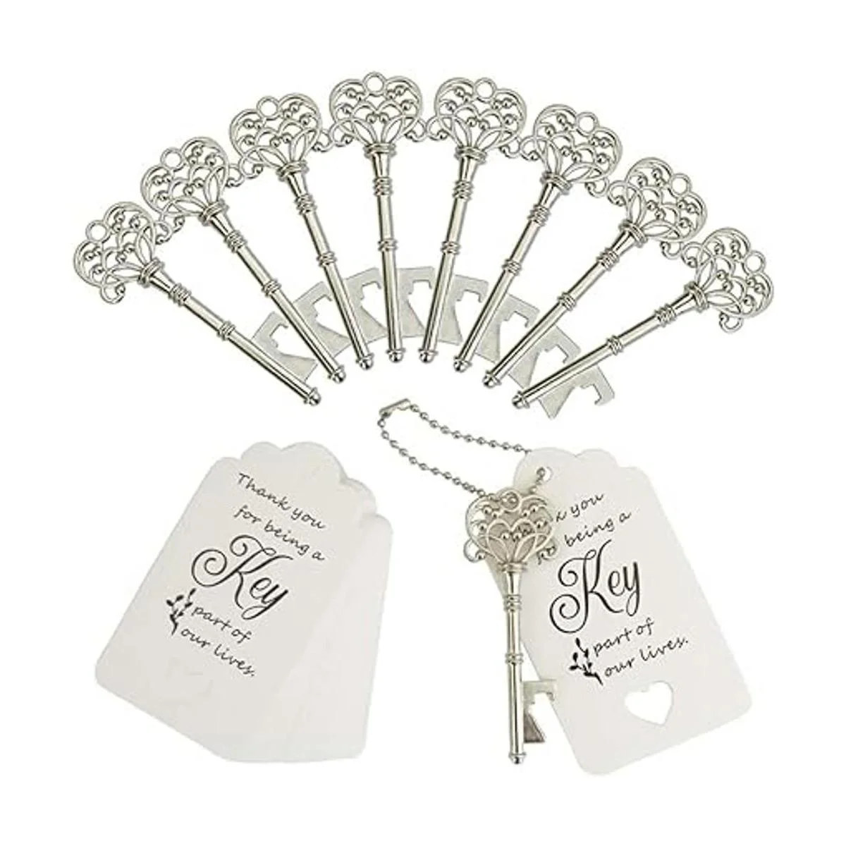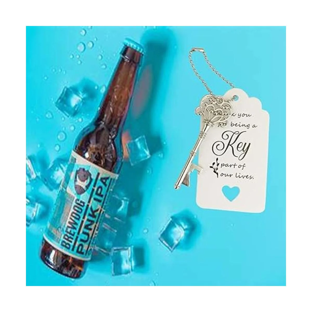 WODEGIFT 100 piezas de abrebotellas de recuerdos de boda, regalos de boda para invitados, abridor de botellas de esqueleto vintage, abridor de botellas con tarjetas de acompañante y llaveros plata