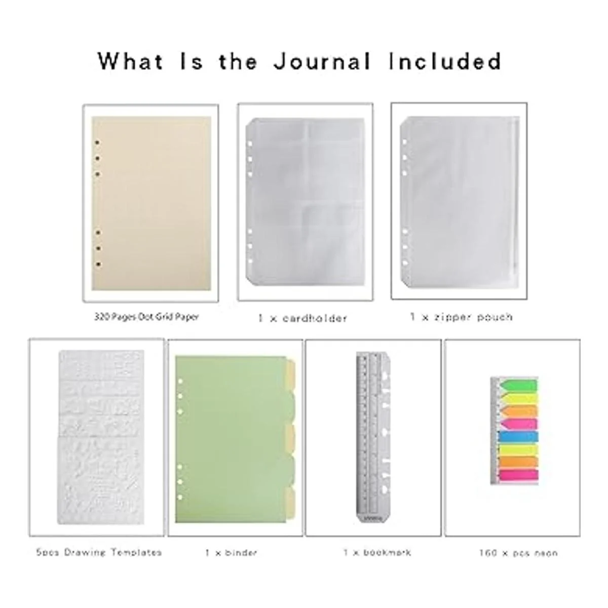 El paquete incluye: 320 páginas de papel de tensión de ojo bajo, con 1 juego de piezas de diario, que incluyen 160 marcadores de página de neón/banderas de notas, 1 bolsa con cremallera, 1 bolsillo para tarjetas, 5 plantillas de dibujo reutilizables, separadores de índice de carpeta, 1 marcador.
