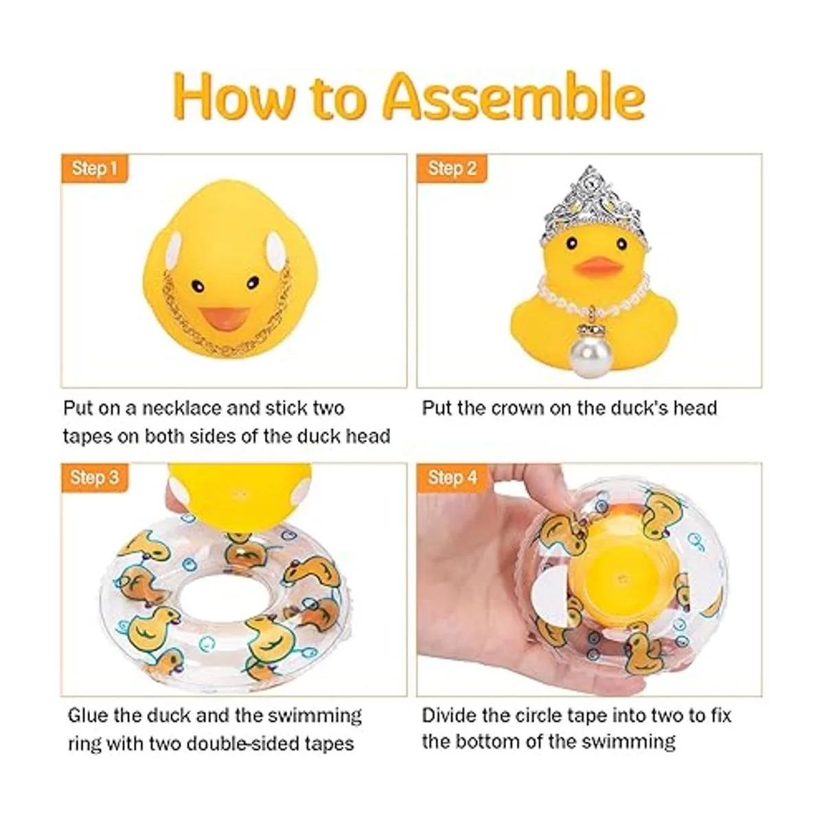 Necesita montar: coloca el collar en el pato, fija la mini corona en la cabeza del pato con cinta, pega el anillo de natación a la parte inferior del pato y luego fija el anillo de natación con cinta adhesiva de doble cara. Si tienes alguna pregunta, no dudes en ponerte en contacto con nosotros, y te responderemos en 24 horas.