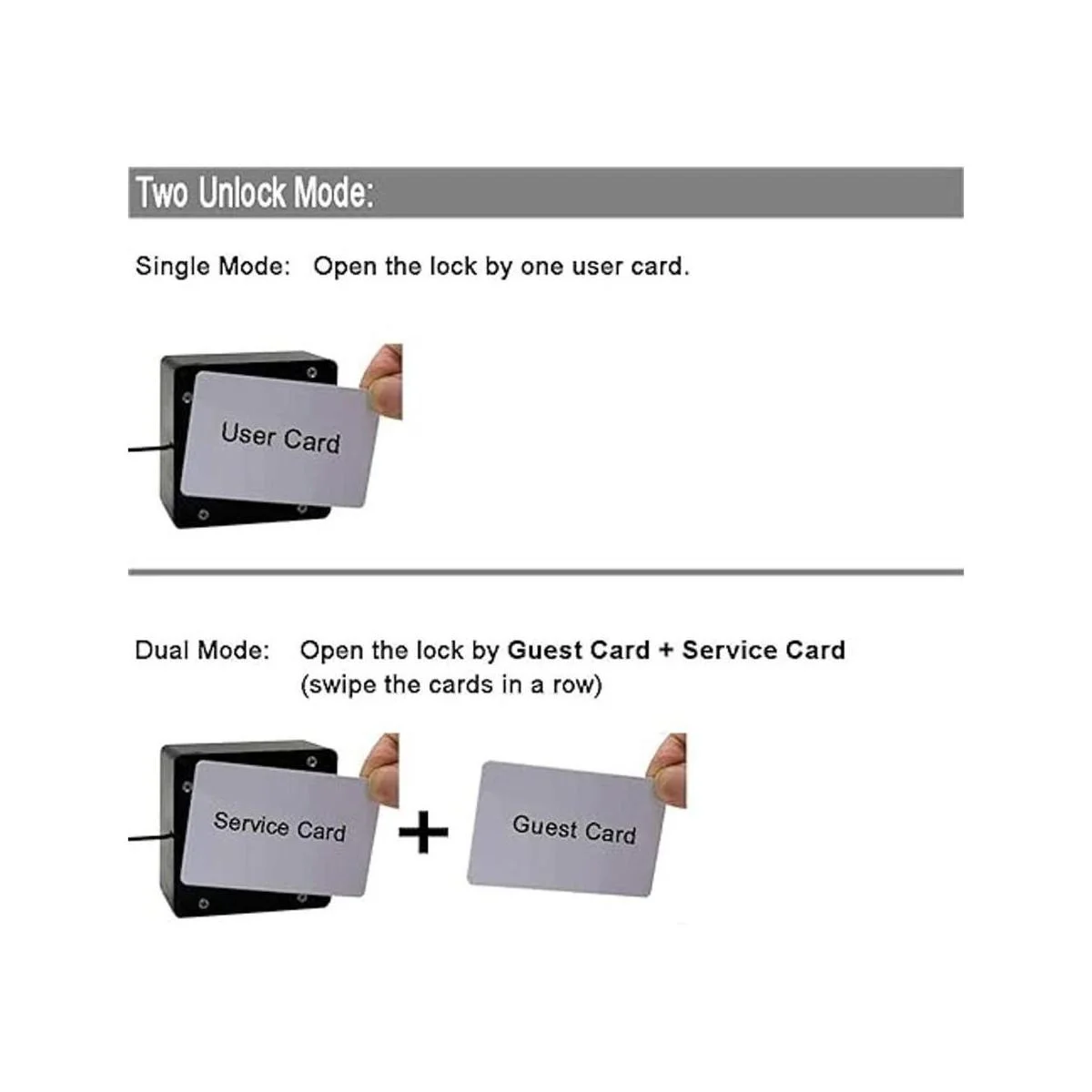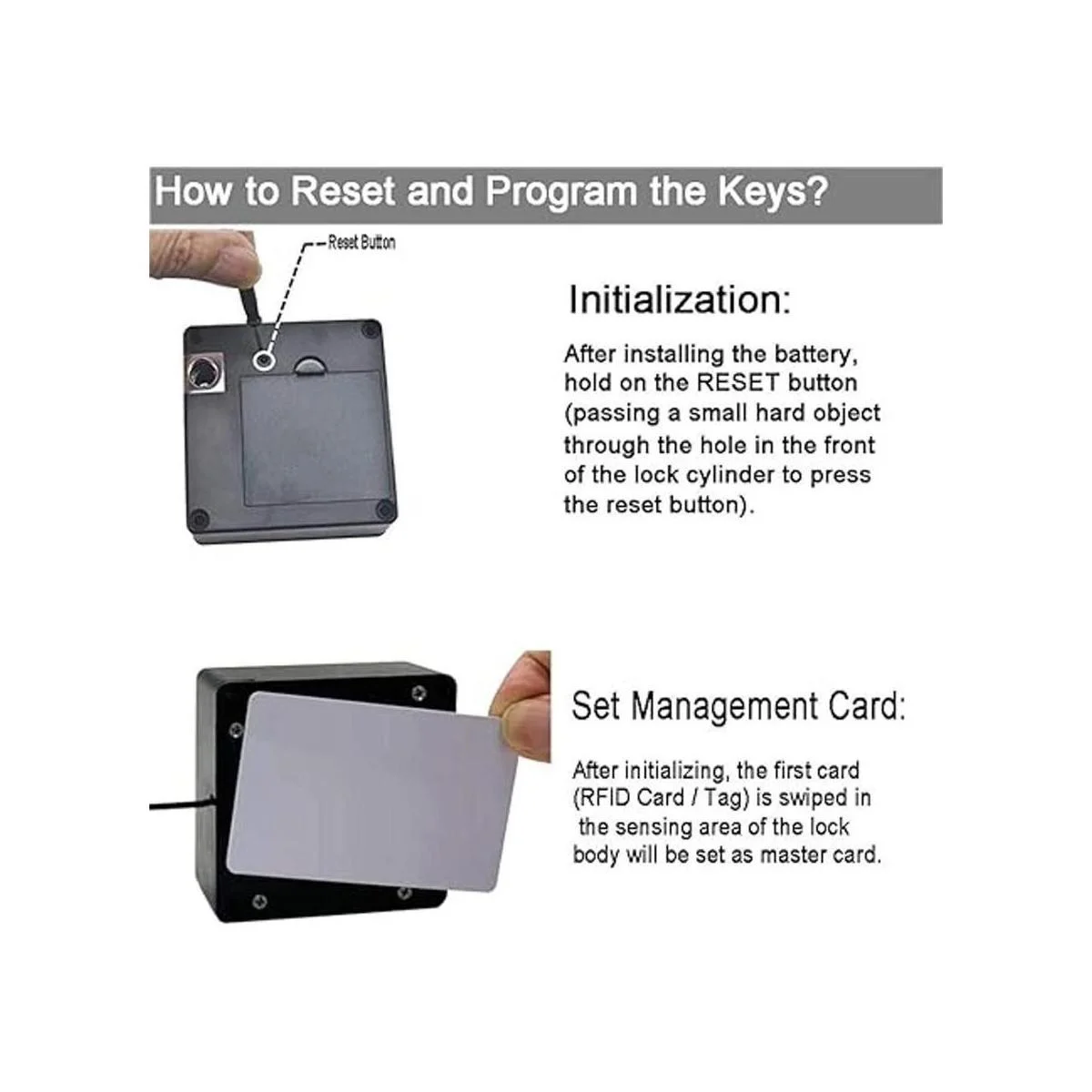 Una llave para múltiples cerraduras: estas cerraduras RFID son programables, y puedes utilizar una llave tarjeta RFID/llavero para desbloquear varias cerraduras de armario como quieras. Lo único que necesitas hacer: programa la llave en las cerraduras y pruébala antes de la instalación.