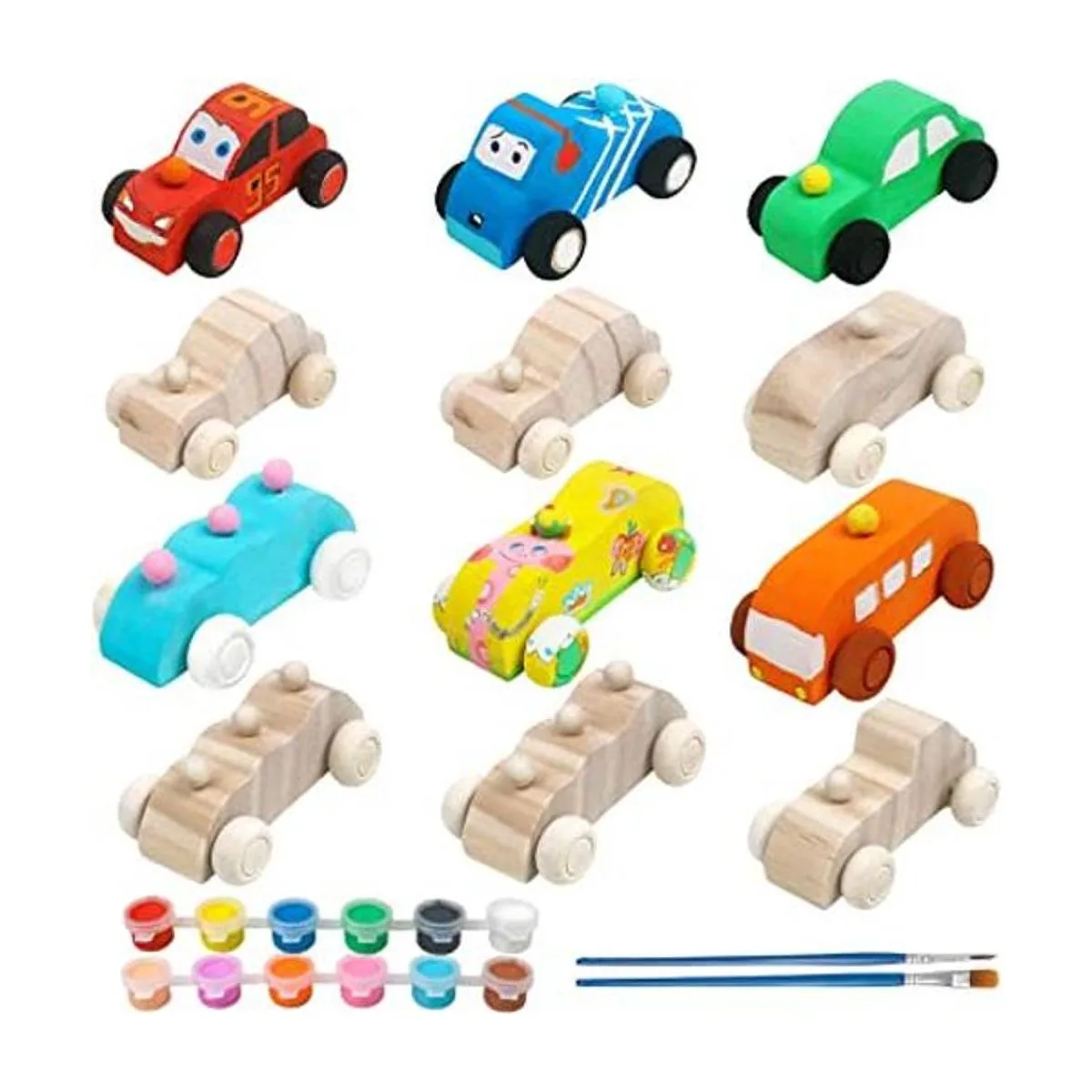 Arts and Crafts:Set includes 12 small cut and sanded wooden cars, 12 pots of acrylic paint and 2 paint brushes.unfinished wood cars are suitable for class teaching, as a craft assignment. Or portray a wooden car with your family as a family activity and share a fun time with your family. It can be used as a painting activity for a birthday party or as a decoration for a room or party.